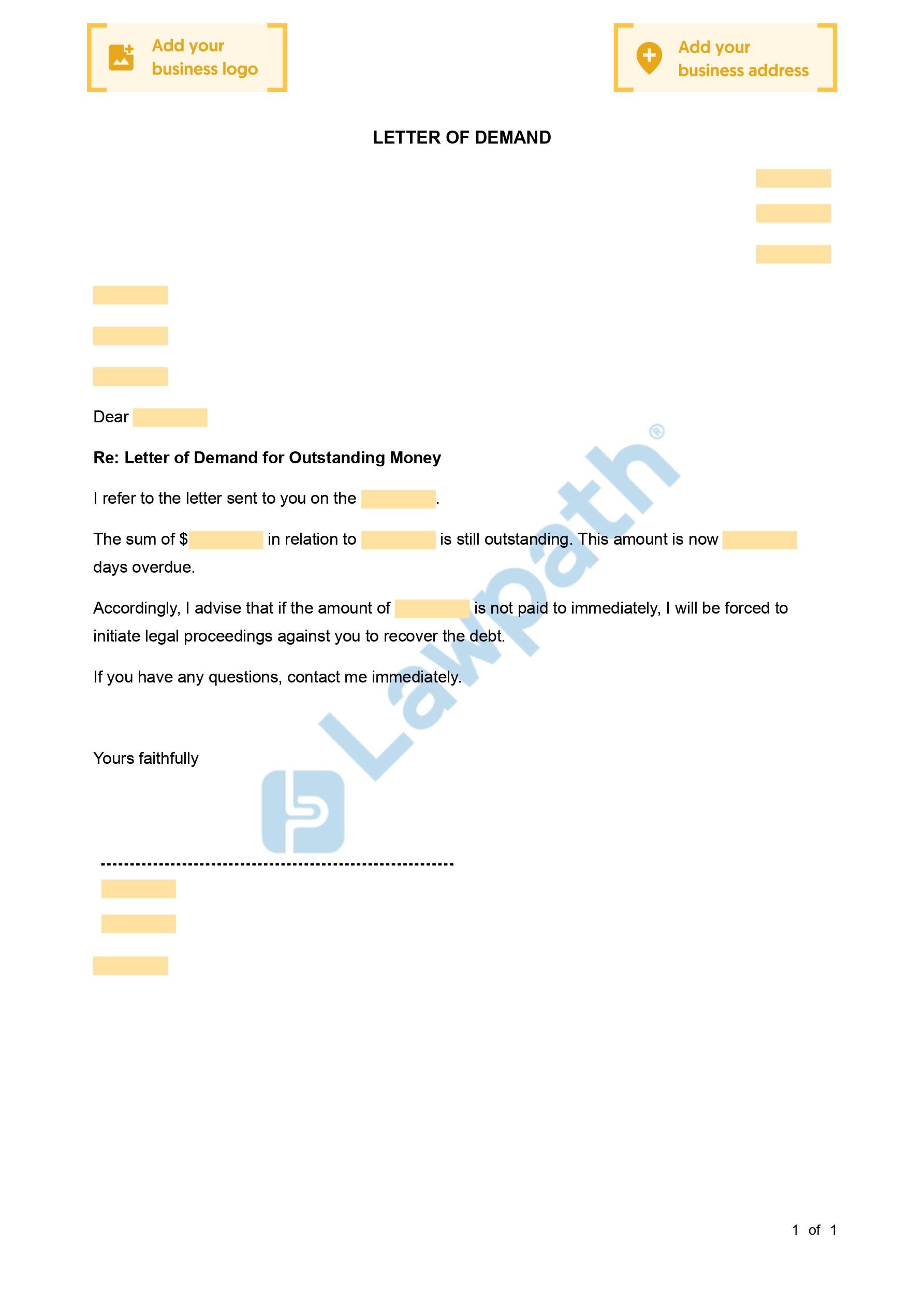 This Letter of Demand is the second letter sent to customers who have outstanding payments. This letter is a firmer and more assertive reminder in comparison to the first letter sent two weeks after the initial message. This sends the understanding that the company is prepared to take legal action if the client continues to ignore the invoice.