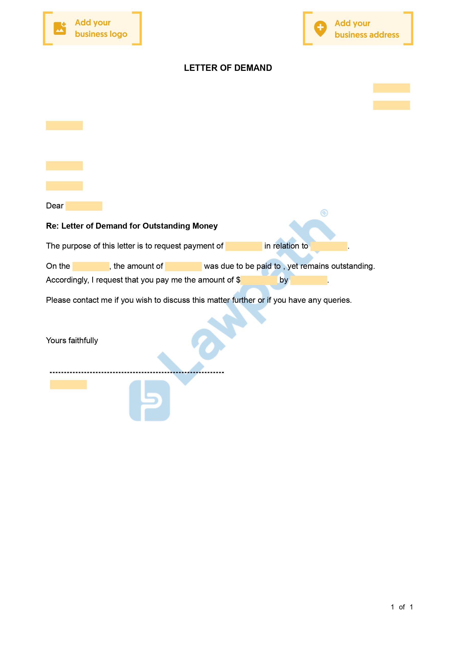 A Letter of Demand is usually sent when numerous attempts to get your invoice paid have been unsuccessful. A Letter of Demand warns the other party that your demand for payment of outstanding money is the final opportunity before you take the matter further.