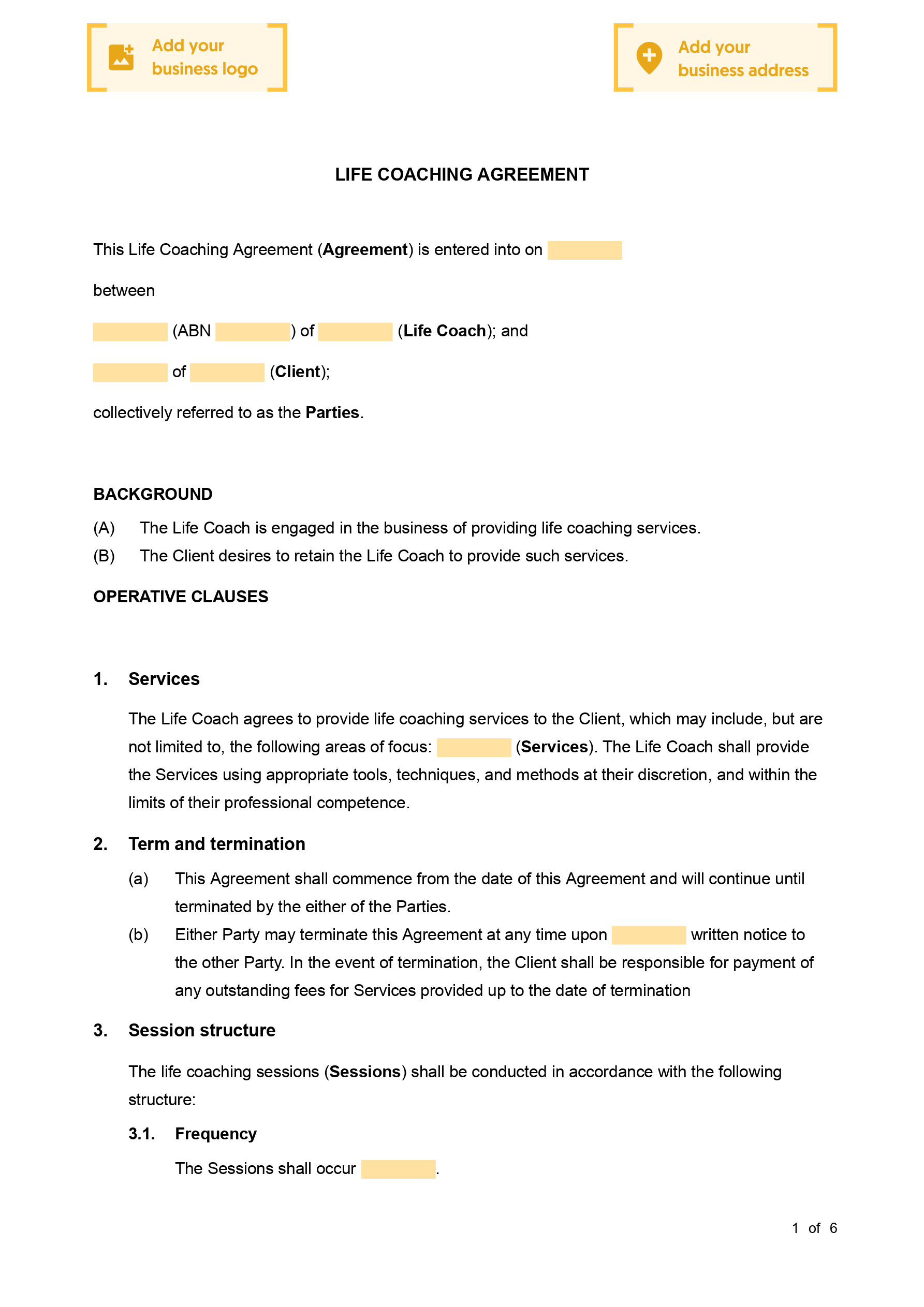 This Life Coaching Agreement is an essential document for a life coaching business to set up binding legal relationships with its clients.