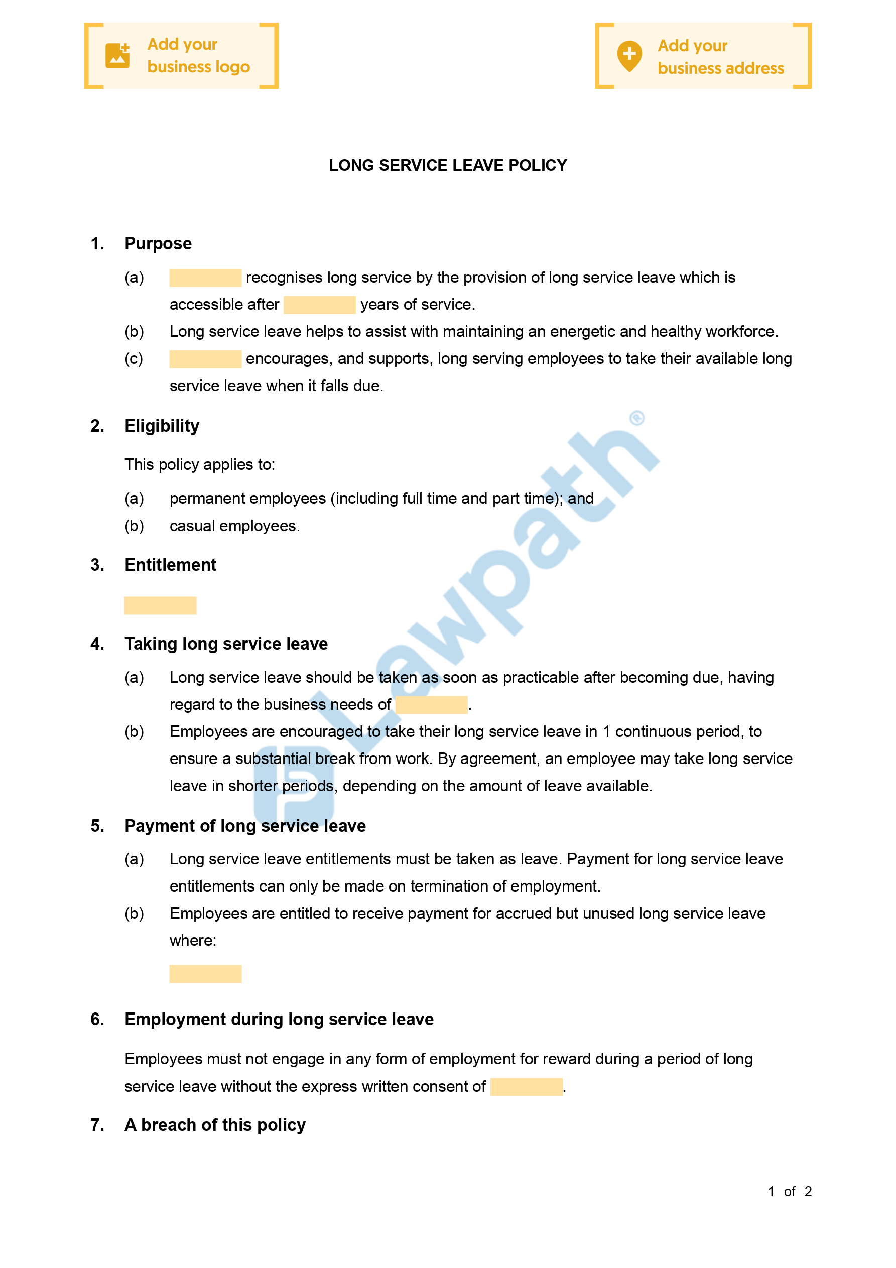 This Long Service Leave Policy can be used to clarify where the entitlement to Long Service Leave is derived from, to assist your employees better understand their leave entitlements. It also ensures that employees who are thinking of taking long service leave are aware of their obligation to notify their manager as soon as possible.