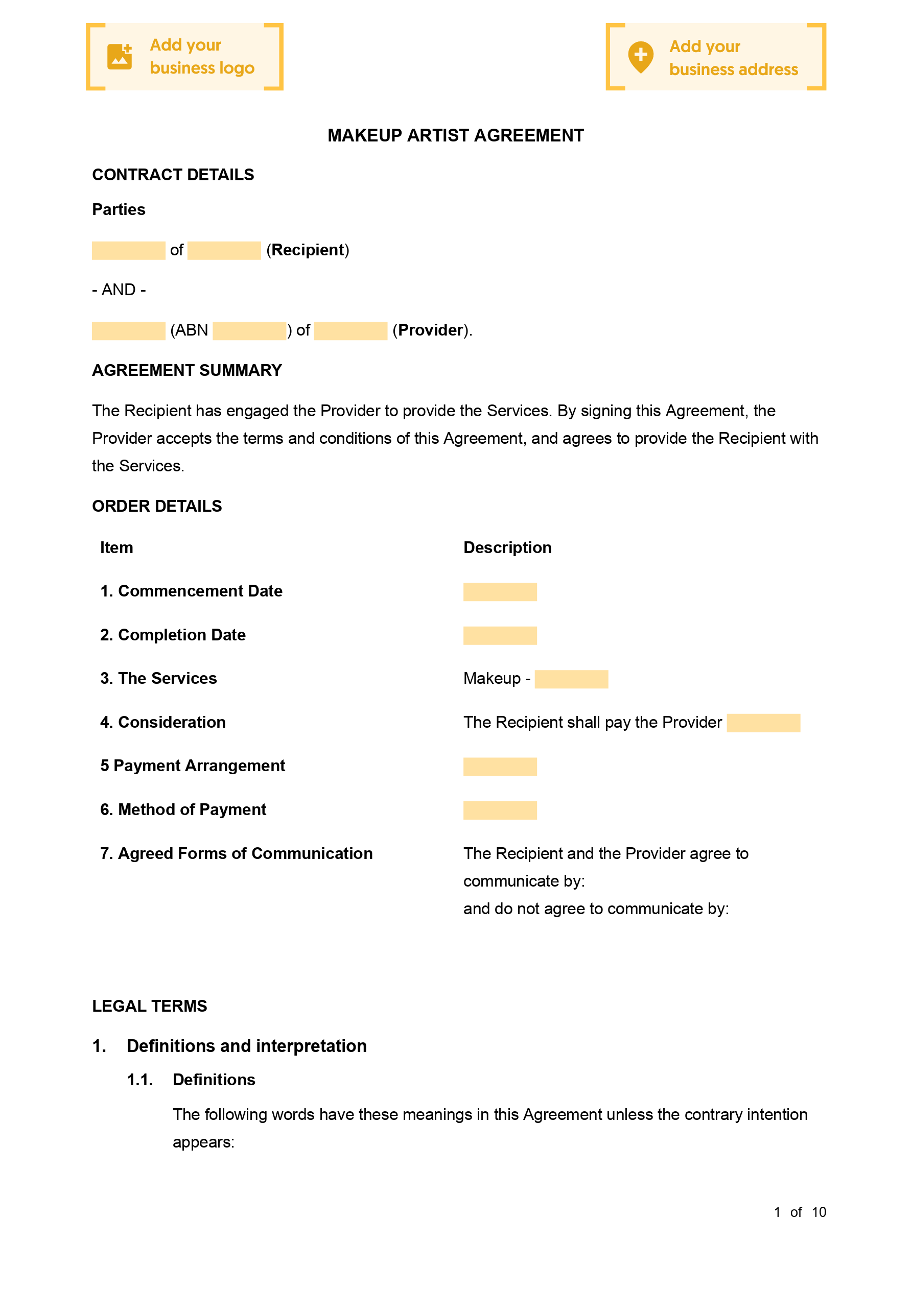 As a makeup artist, it's important that you have the right documents in place to make sure your services are delivered effectively, and even more importantly, that you get remunerated for those services. A Makeup Artis Agreement sets out the terms and conditions between you as the service provider and the recipient of your services. If you are providing makeup artist services, you need to set out the terms and conditions of those services.