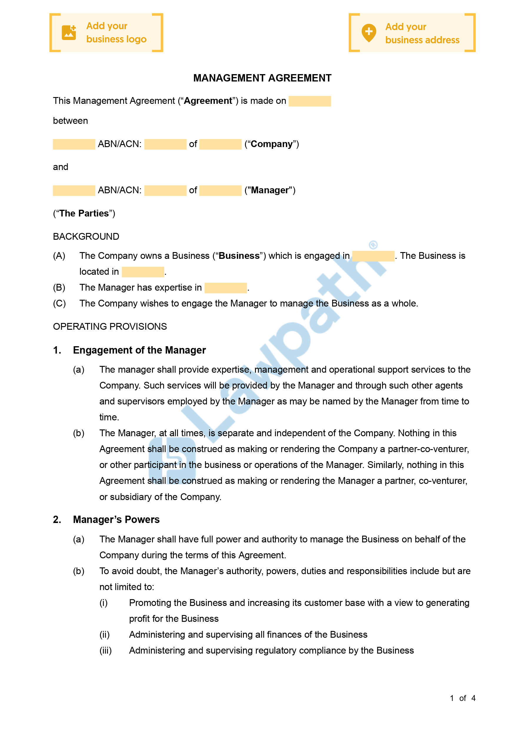 This document is relevant where a Company wishes to hire an external specialist, either an individual or a Company, to manage a business it owns. Often, companies hire external managers when they lack the experience or capacity to run the business on their own, or if they want to take advantage of the Manager’s expertise in a particular area of business.