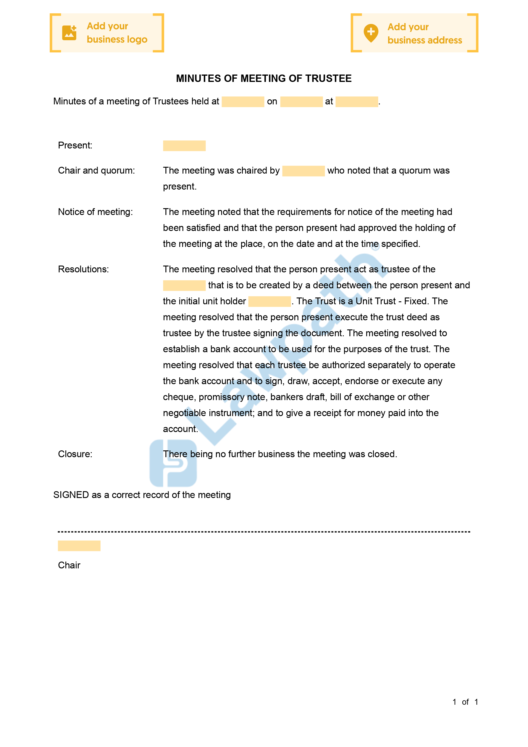 When setting up a trust, the trustee may be a company. If that is the case, this document must be utilised when having any meetings concerning the trust.