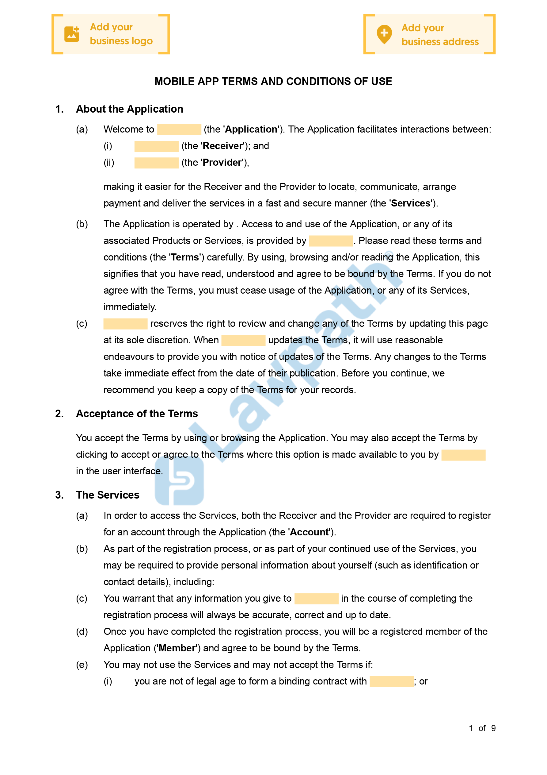 Any user wanting to interact with the marketplace on your website should be required to agree to these terms before entering. This agreement could come in the form of a pop up before they enter the marketplace, or be included within the general terms and conditions agreed to when the app is initially downloaded. This document outlines the terms and conditions in regards to how the market place is used and regulated, as well as regulate how the buyers/sellers using your service will interact and complete their transactions. Having a Mobile Terms and Conditions of Use (Marketplace) will ensure that your application is protected, as well as the users who interact with it.