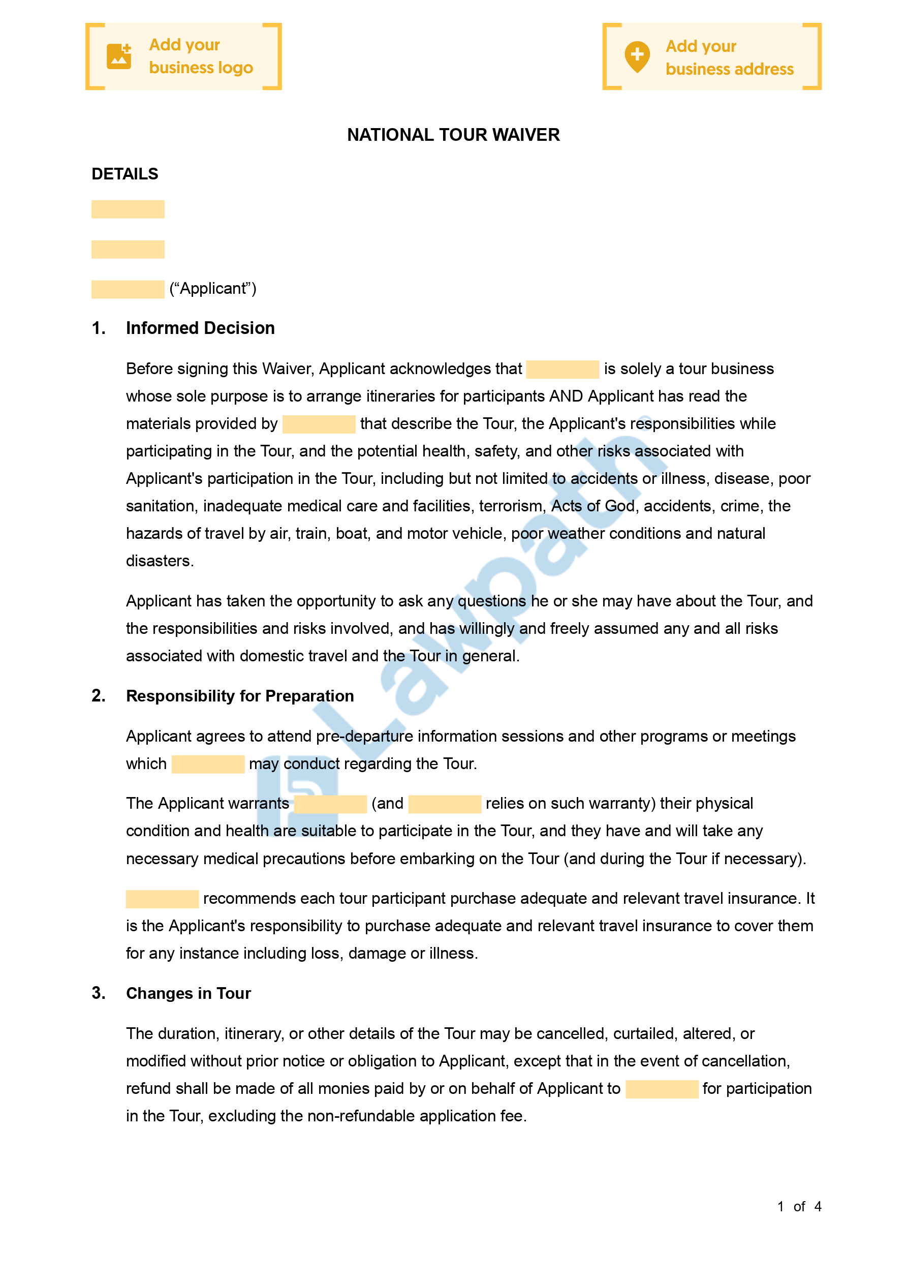 A national tour waiver outlines an agreement between the customer and tour business to waive and release liability. This agreement waives the right of the customer to sue your business if any mishaps, injuries or loss were to occur whilst on tour. In addition, the document will also outline the potential risks associated with travelling on a domestic tour. These risks must be acknowledged and accepted by customers prior to travel.