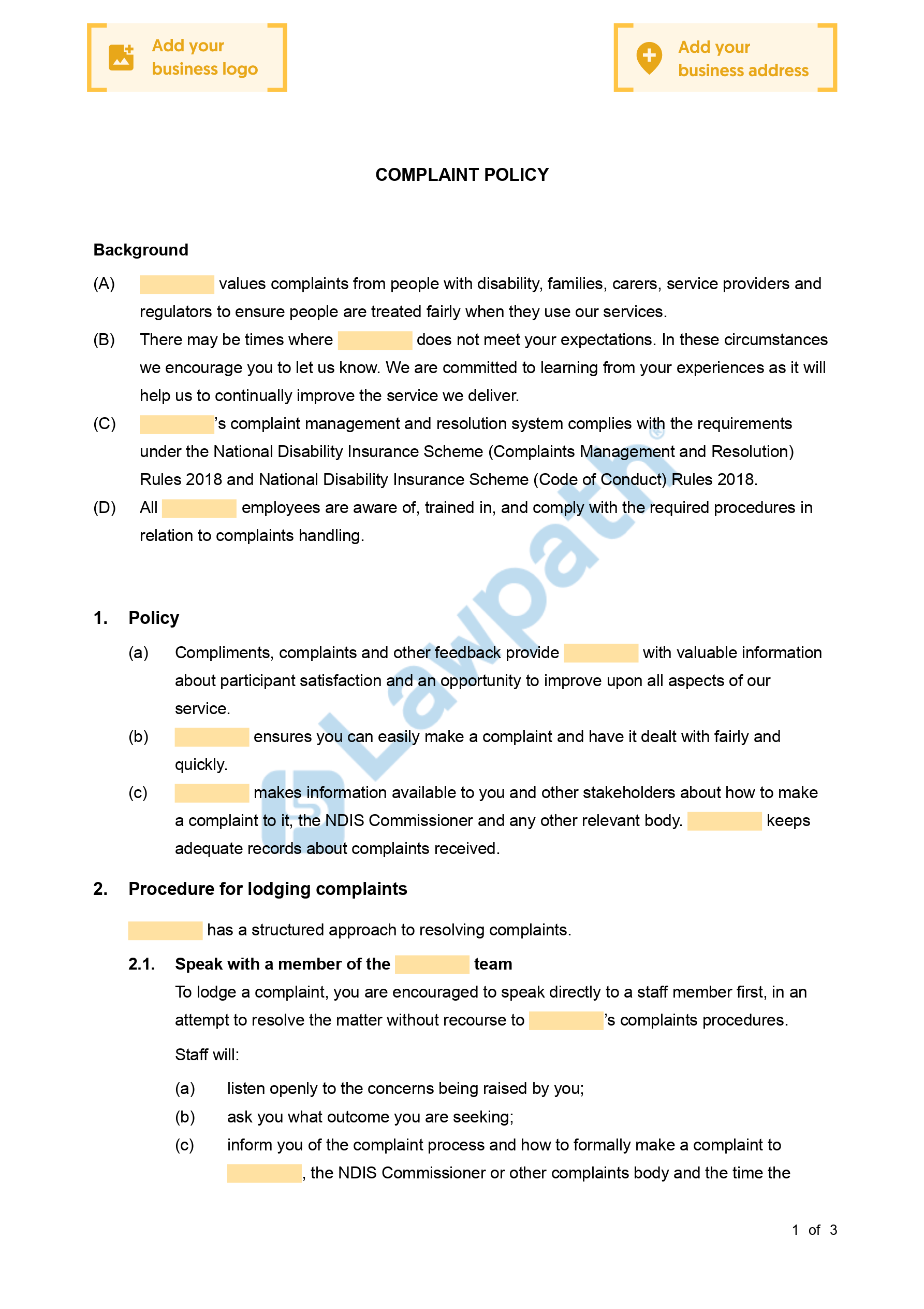 View Sample NDIS Complaint Policy