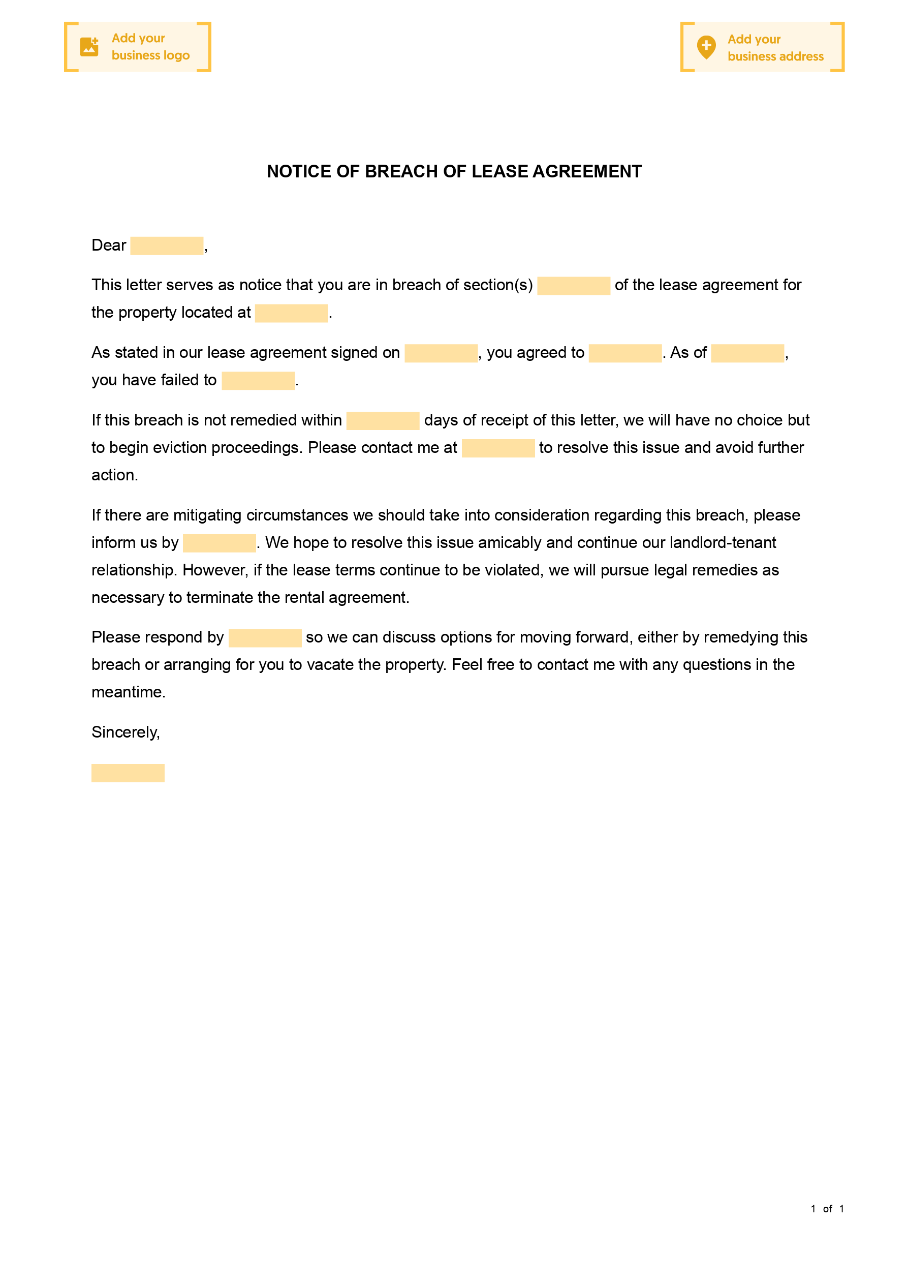 This notice may be used as part of a series of notices. For a warning that can be sent following the breach but before two weeks have passed, see the Breach of Lease Warning Letter (Residential Lease). For a notice that can be sent once the two-week notice period has passed and the tenant must vacate the property, see Eviction Notice (Residential Lease).