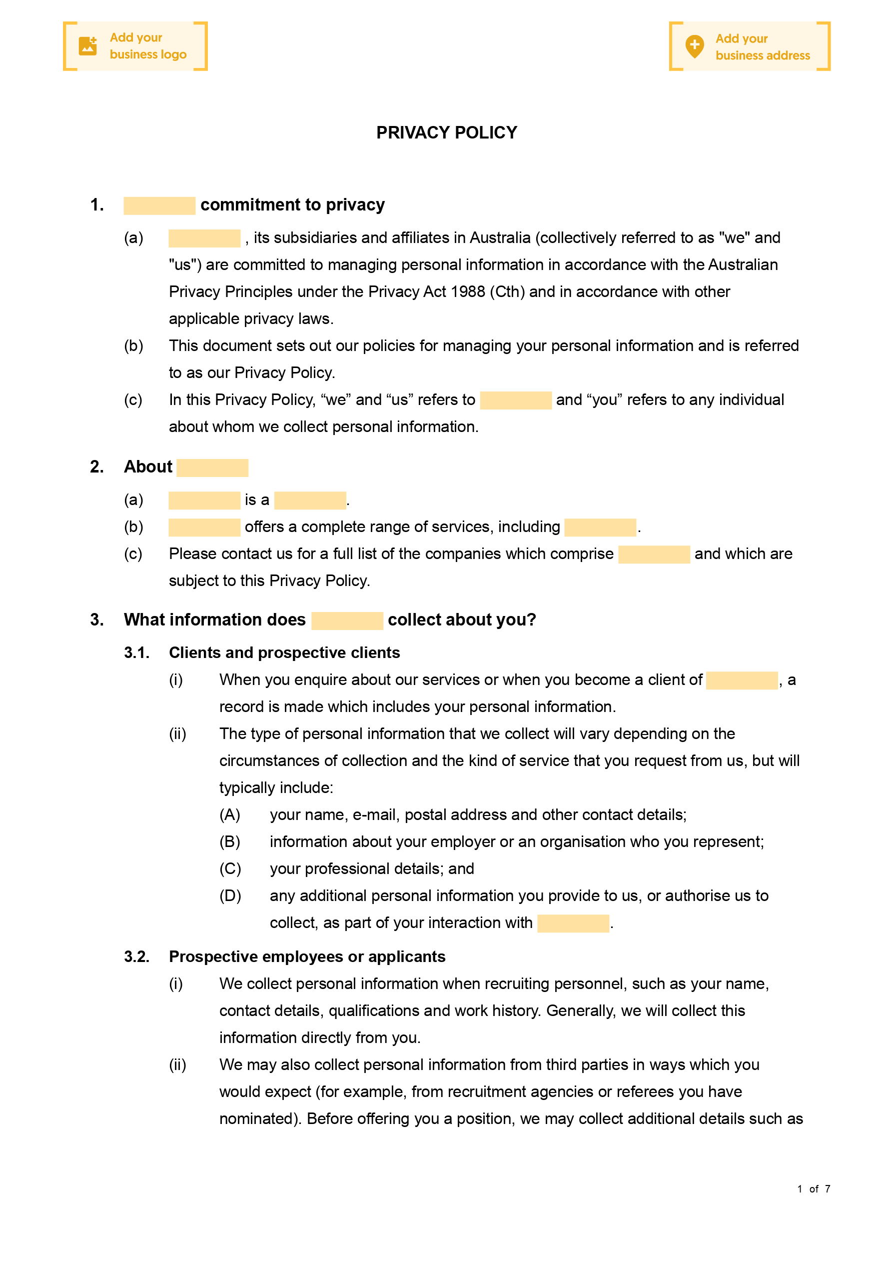 A Privacy Policy outlines how your business will use, store and collect your customers information. This is a general Policy that covers the collection of data through various mediums, including through both offline and online channels.