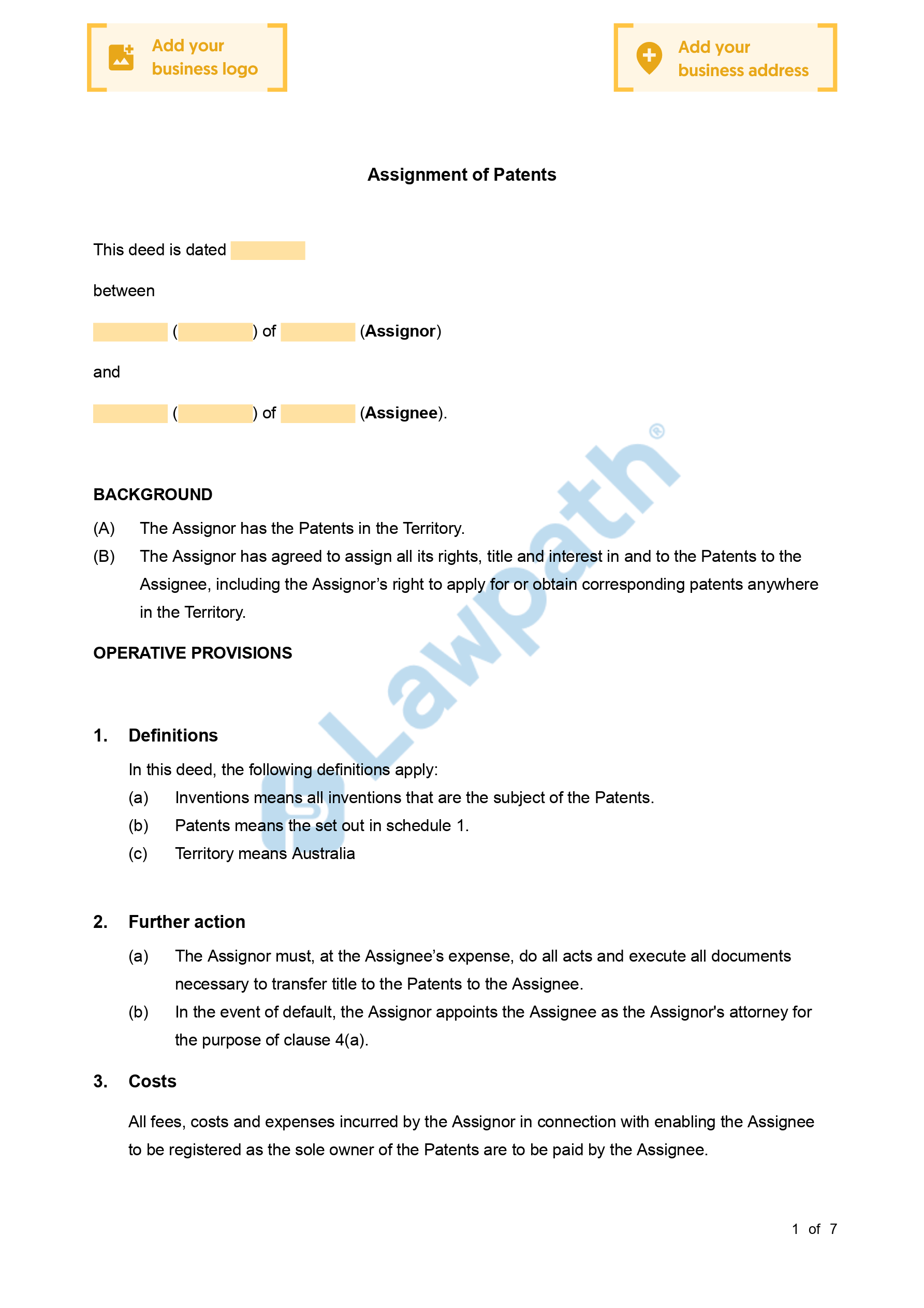 Create quality document for your Patent Assignment with instant document builder of Lawpath. Transfer up to four patents or applications easily. Draft yours now!