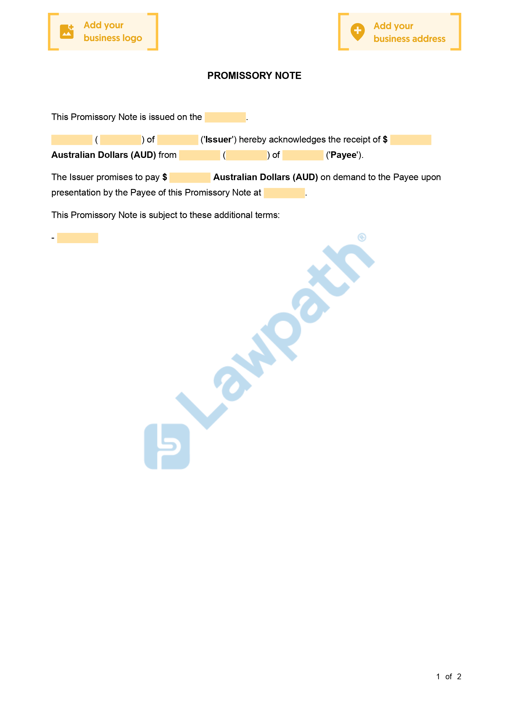 A Promissory Note is a negotiable instrument that allows you to set out the payment of a sum of money.