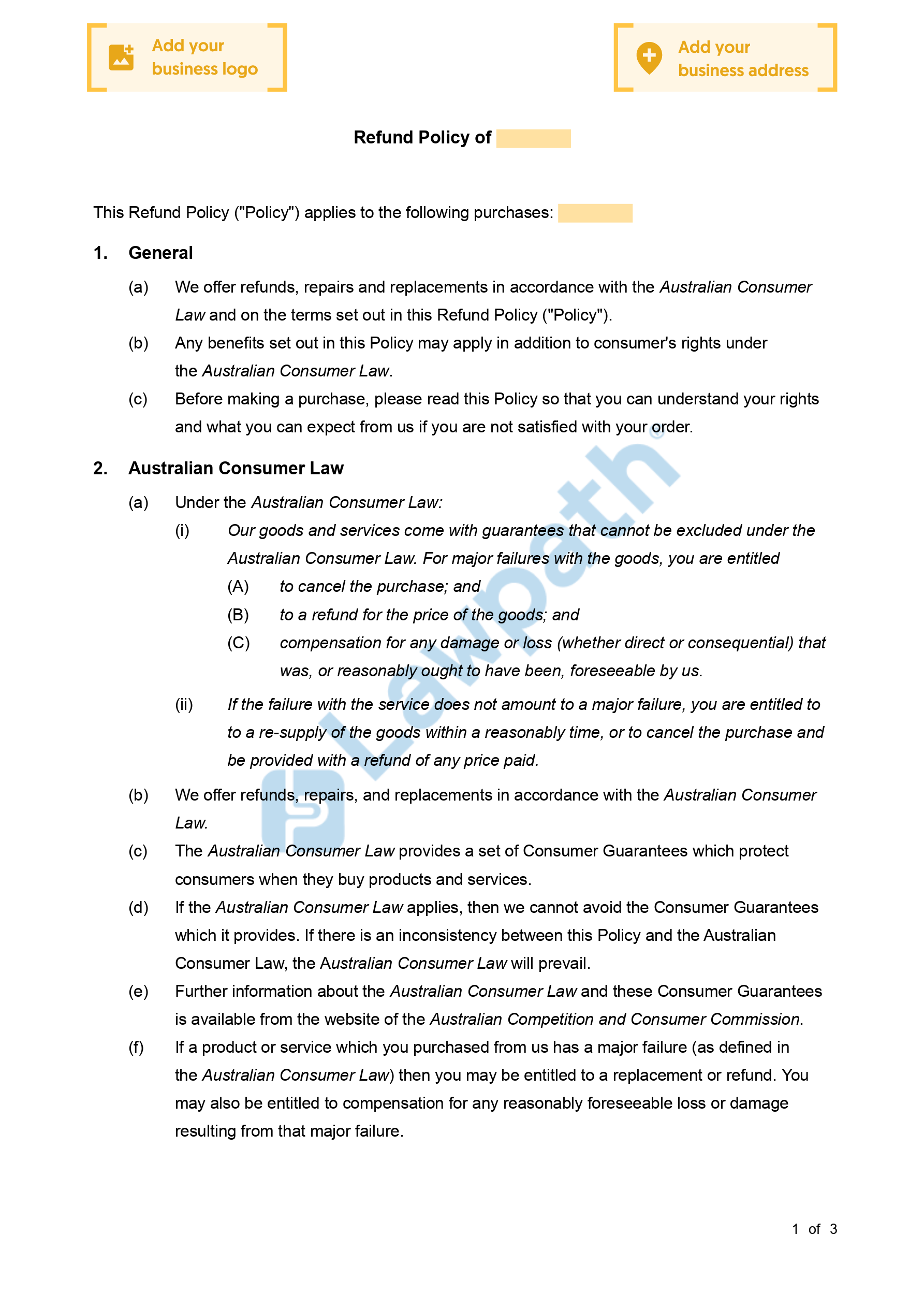 A Refund Policy is a document that enables your business to inform customers of your refund and returns process. Under Australian Consumer Law, customers have the right to choose either a refund or exchange if a product or service has a major problem. This is deemed to be products or services that are unsafe, significantly differ from their description, or have an issue that would have stopped the customer from purchasing had they known beforehand. Even if the problem does not classify as major, the customer is still entitled to have the issue repaired in a reasonable amount of time.