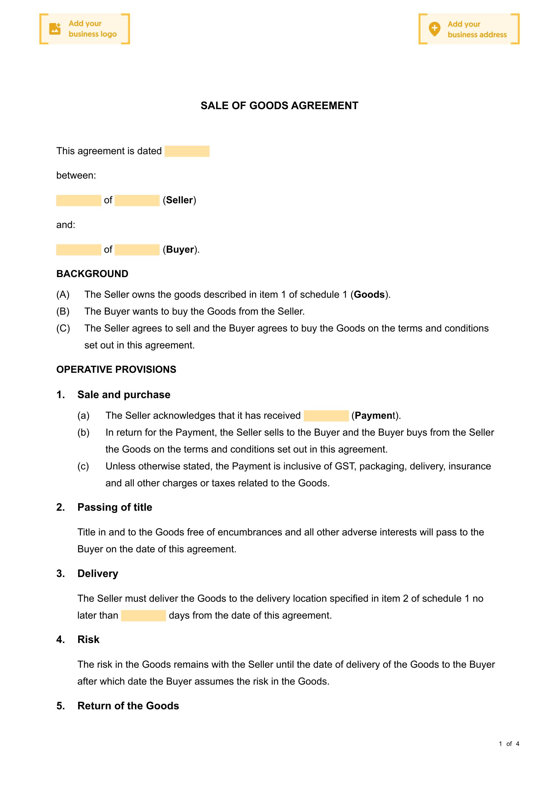 While the Sale of Goods Agreement provides a good framework as a simple contract, each agreement must be customised to reflect the requirements of the relevant seller and buyer. For example, matters such as the manner in which goods are ordered and delivered may vary depending on the internal policies and procedures of the Seller. Additionally, it should conform to the applicable legislation in each state and territory that govern the transactions involving sale of goods.