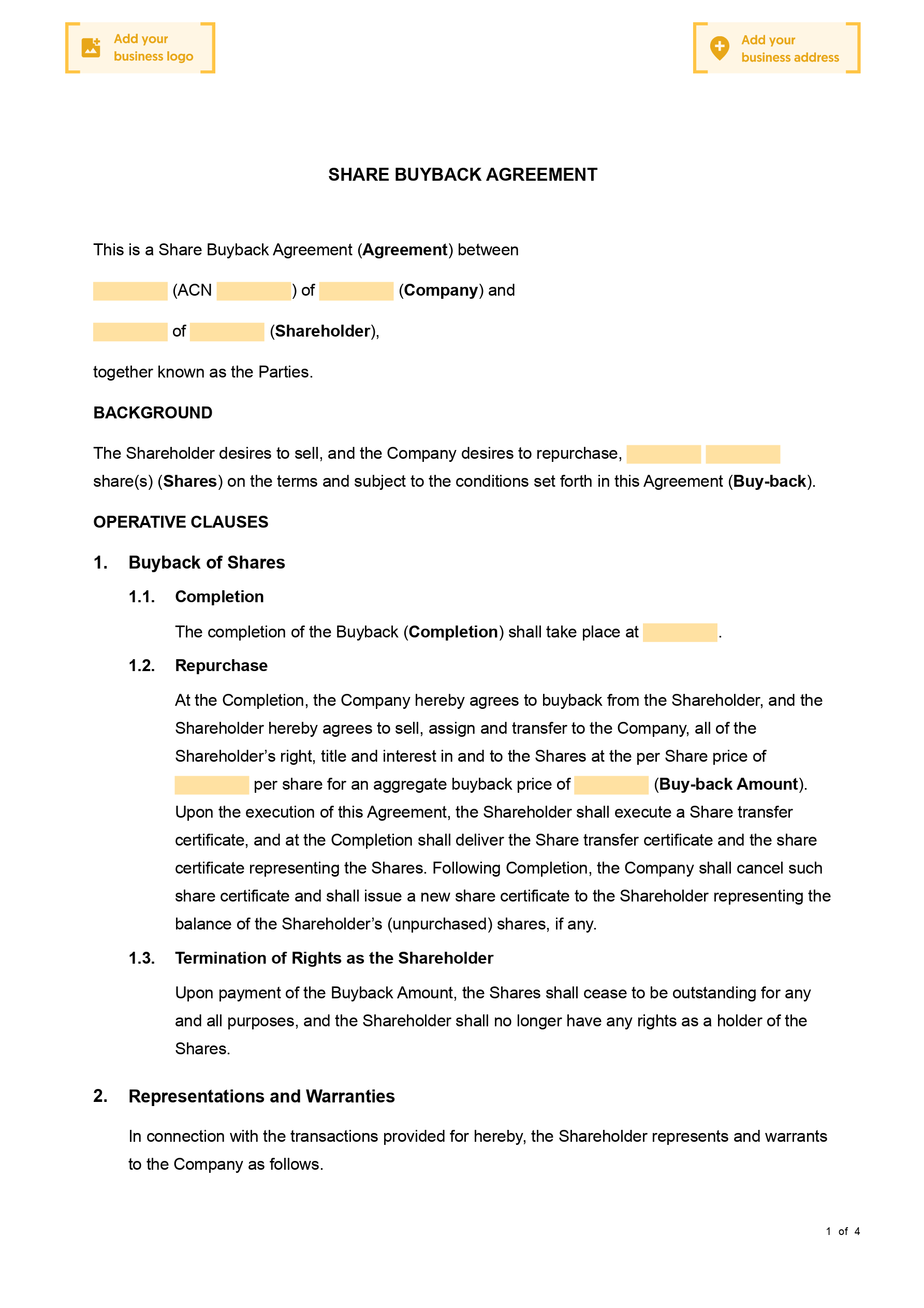 WARNING: to effectively complete a share buyback process, many steps must be taken before and after signing this Agreement. If these are not taken, ASIC may invalidate the whole process. We highly recommend becoming familiar with section 257B of the Corporations Act 2001 (Cth) and seeking legal advice.