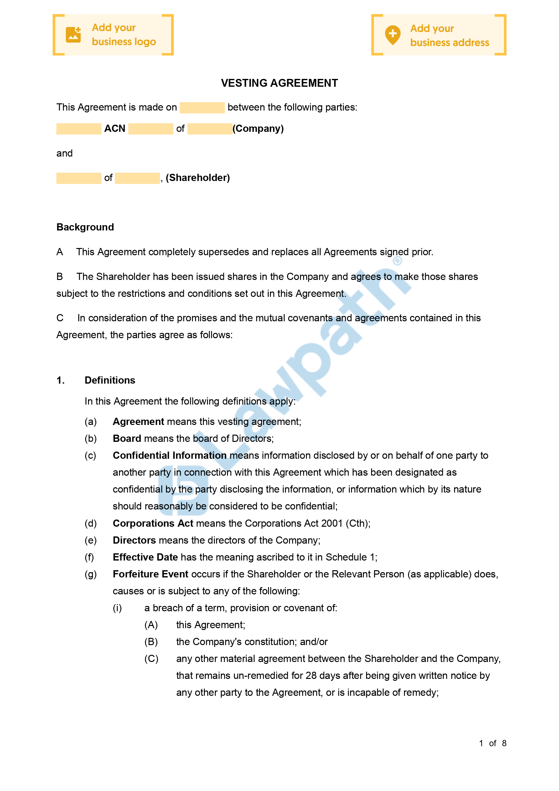 A Share Vesting Agreement is a document that enables a company to implement vesting conditions on certain shareholders’ shares. This agreement is to be used when the shares have already been issued in full and the company would like to add vesting conditions to those shares. If the vesting conditions are not met, the company has the right to ‘claw’ back the shares under this agreement. This document includes the details of the shareholder that the vesting applies to and the vesting criteria the Shareholder must satisfy.