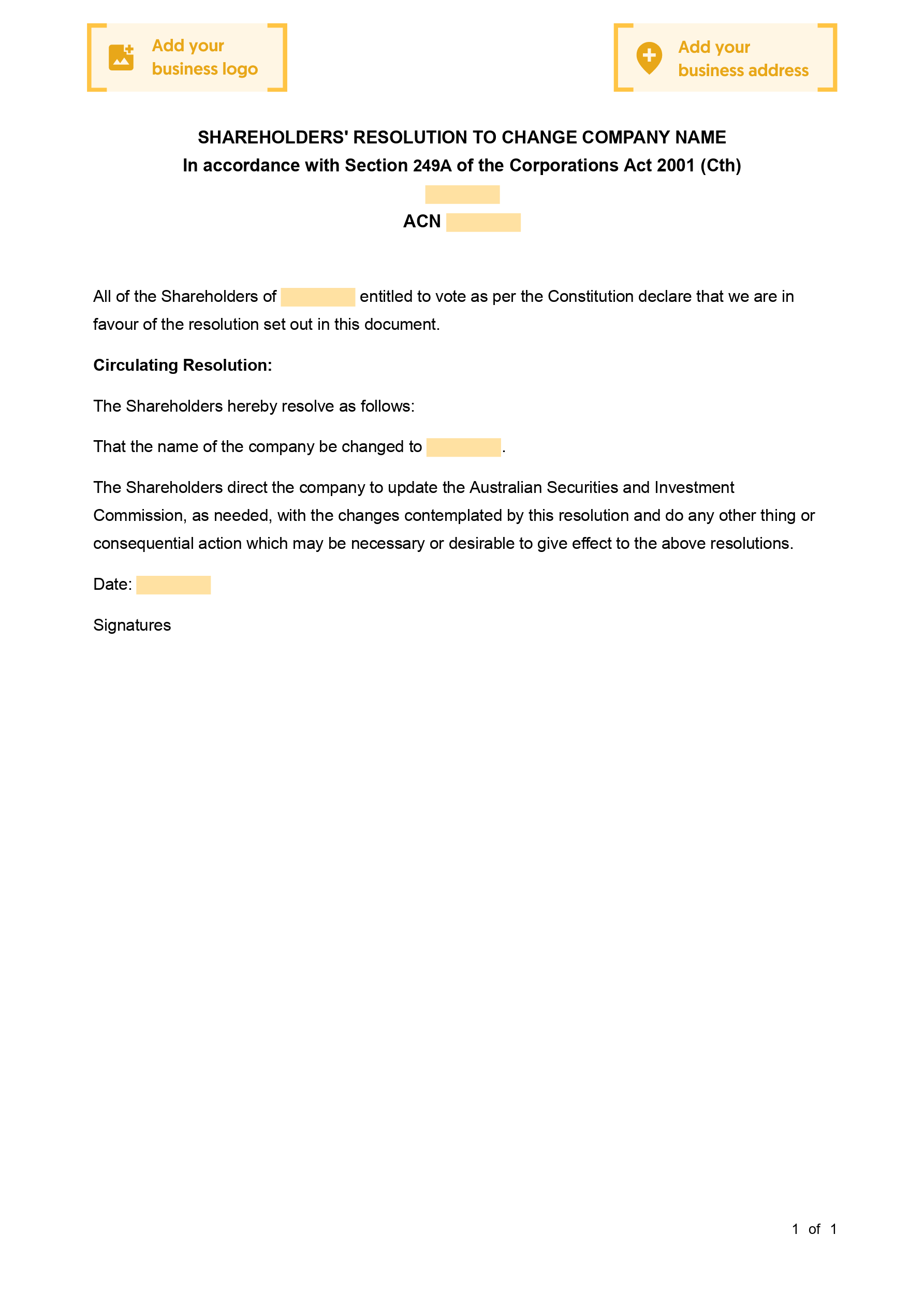 Complete your free Shareholders' Resolution to Change Company Name (Circulating Resolution) with our checklist