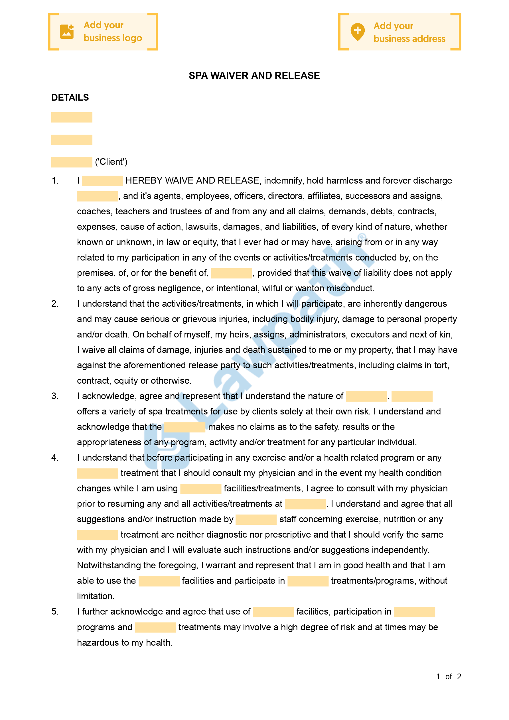 A spa waiver outlines an agreement between the customer and spa business to waive and release liability. This agreement waives the right of the customer to sue your business if any injuries, damage or loss were to occur as a result of using your spa services. In addition, the document will also outline the potential risks associated with receiving treatments at your spa. These risks must be acknowledged and accepted by customers prior to commencing