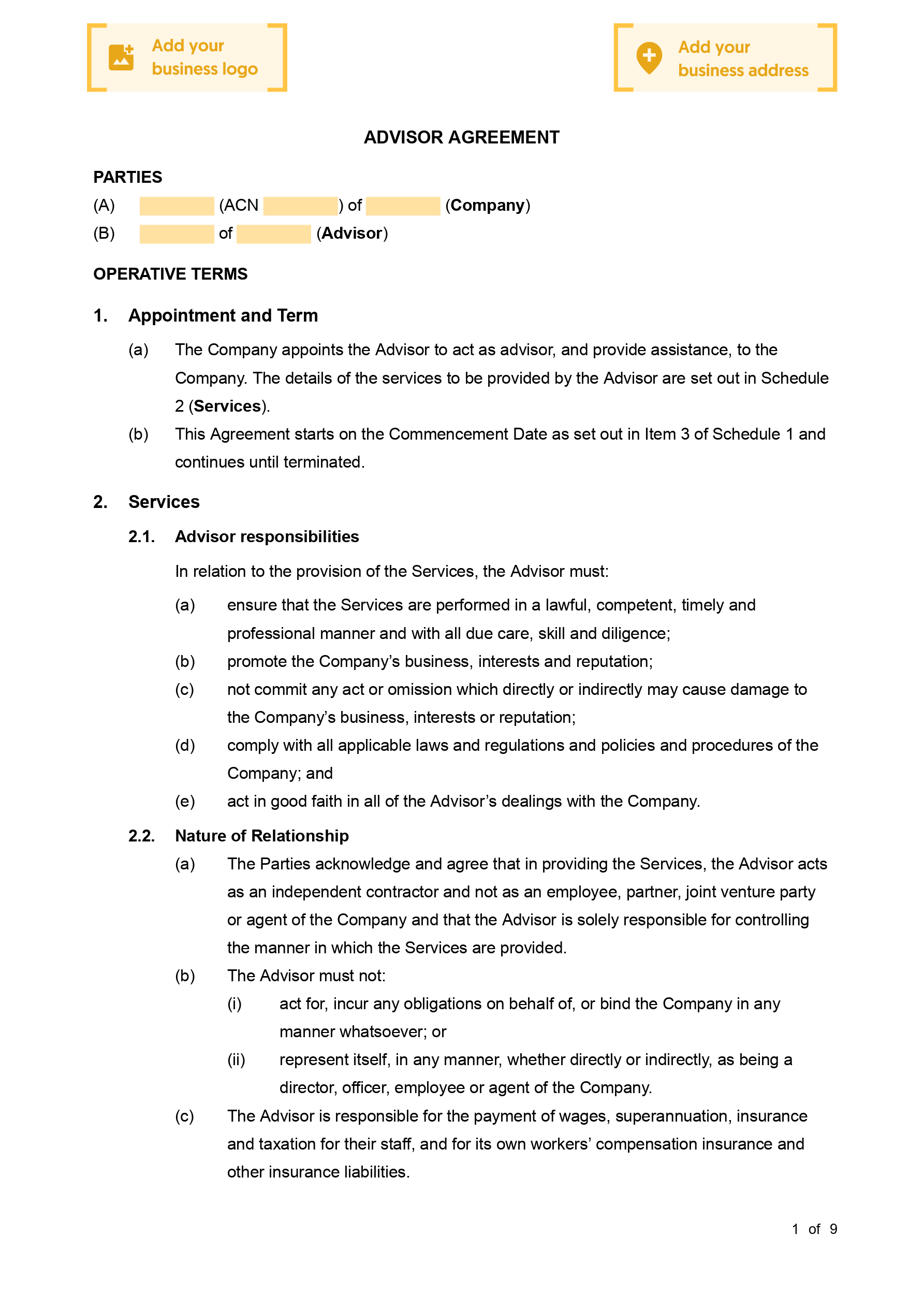 - Independence of advisor, expenses, GST and responsibilities of advisor; and