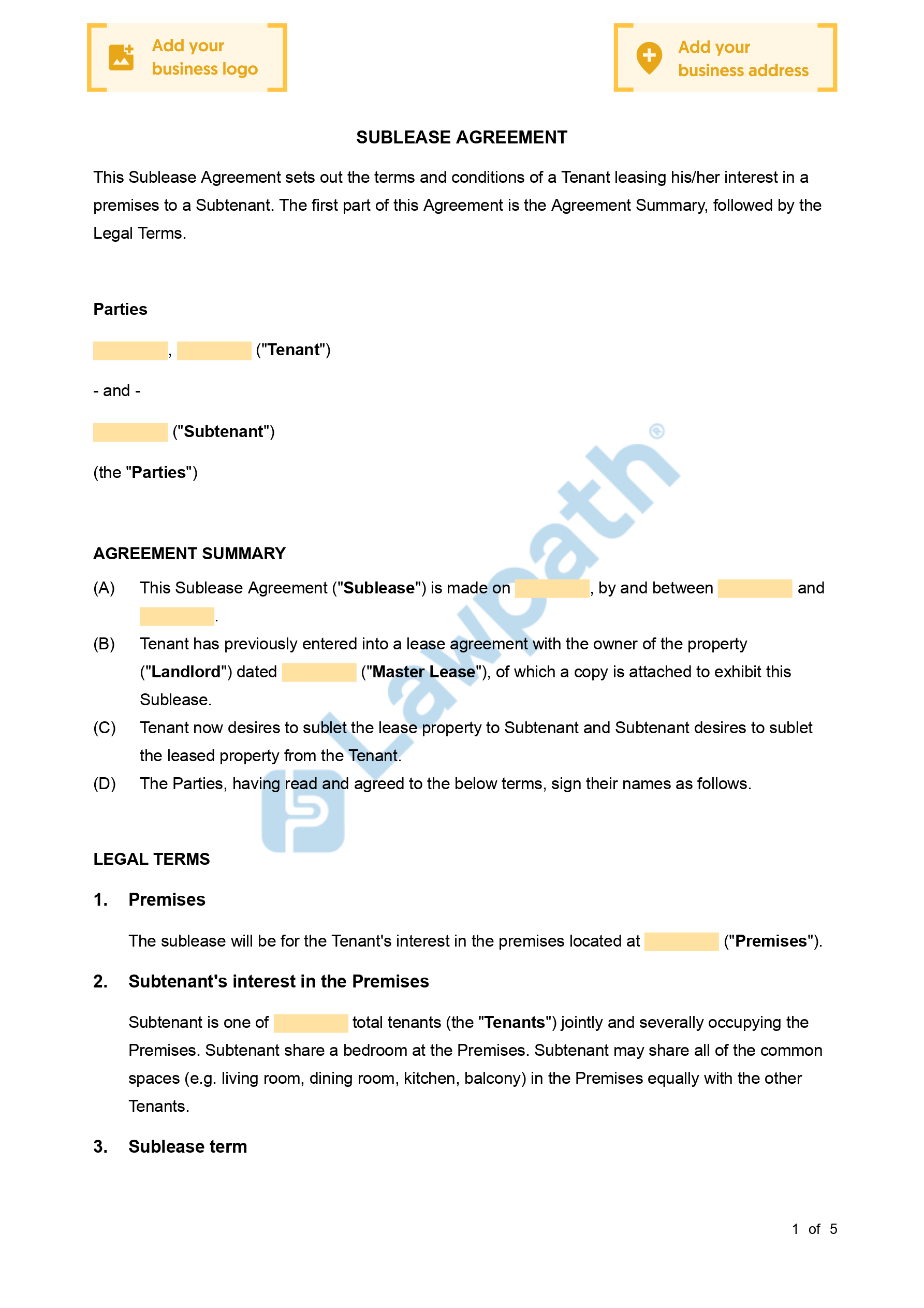A Sublease Agreement allows you, as a tenant to sublease your residential property to a subtenant.