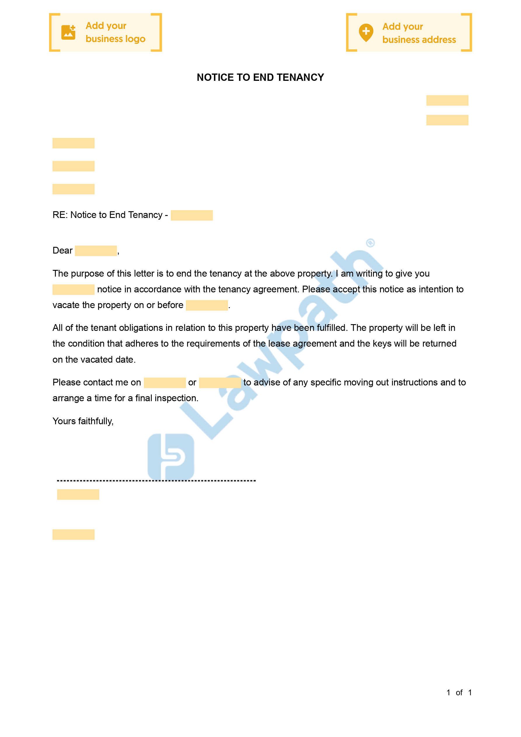 A Tenant's Letter Giving Notice to End Tenancy is a document which informs a landlord of the tenants intention to terminate their lease. If you want to end your tenancy when the fixed term period of the agreement is due to run out, you will need to give at least 14 days' notice to your landlord. This notice can be given up to and including the last day of the fixed term, but can not be given after, otherwise the notice will not be valid. If you want to end your tenancy after the fixed term has ended, you will need to give at least 21 days' notice to your landlord. However, you must pay the rent up to and including the day your notice ends and you vacate. By giving your landlord an end of tenancy document, it can help you leave on good terms with your landlord and ensure that there will be no further complications down the line.