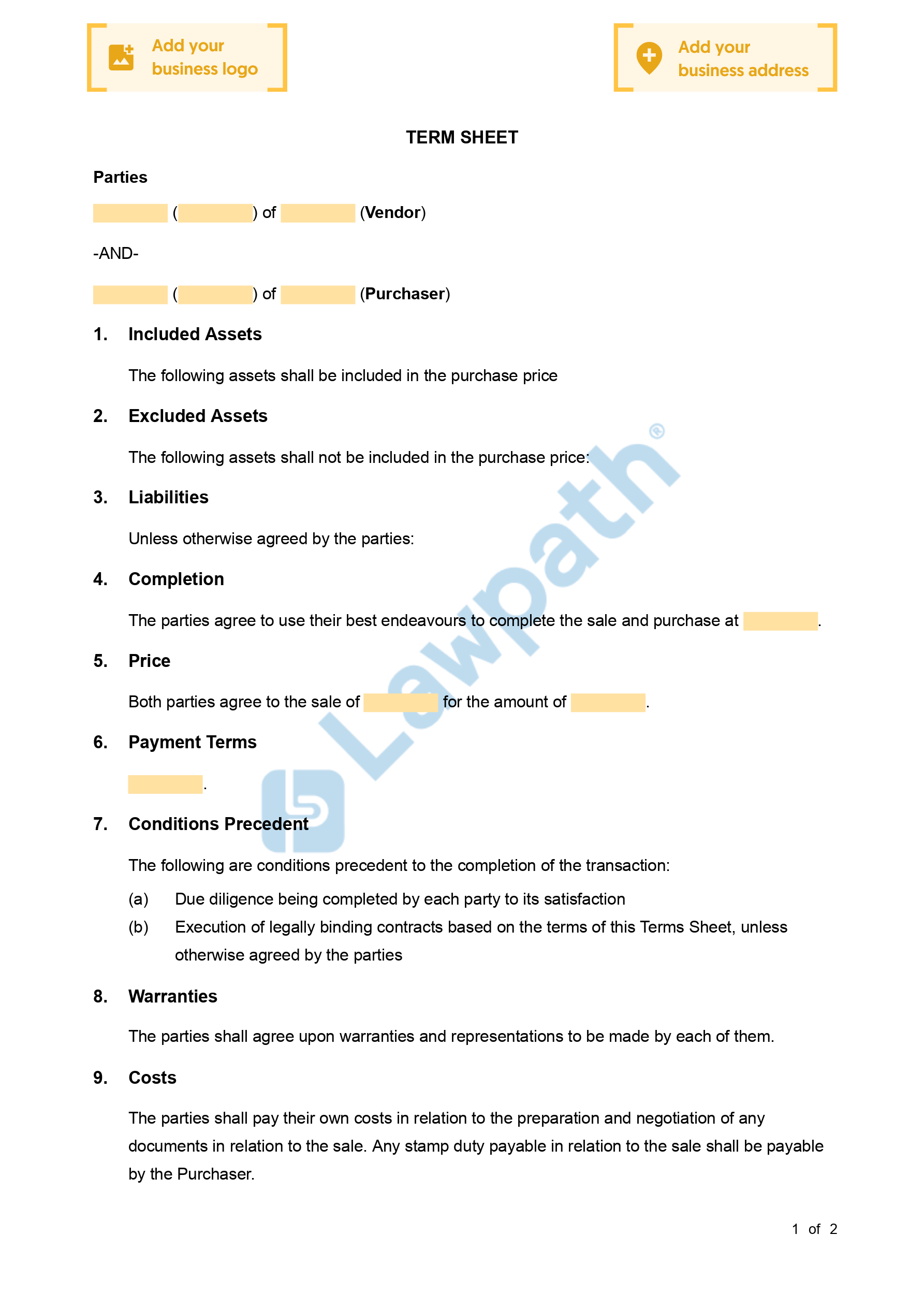 Overall, a term sheet should be viewed as a transitional document for the vendor to prepare the business for sale at an operational level, ensuring that its value is maintained, and for the purchaser to ensure that they know what to expect when buying the business.
