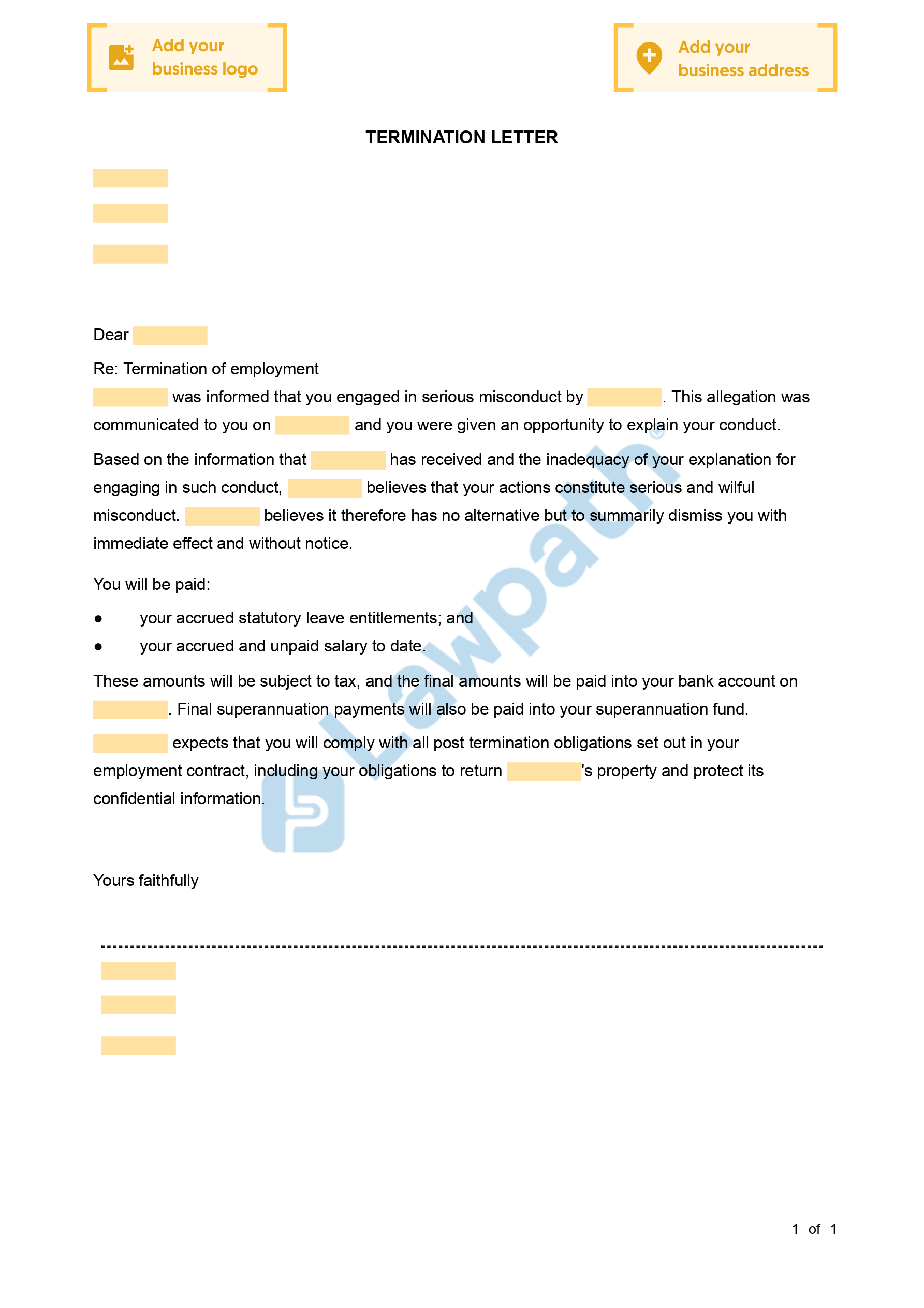 A Termination Letter (Serious Misconduct) allows you to formally notify and record the termination of your employee due to serious misconduct.