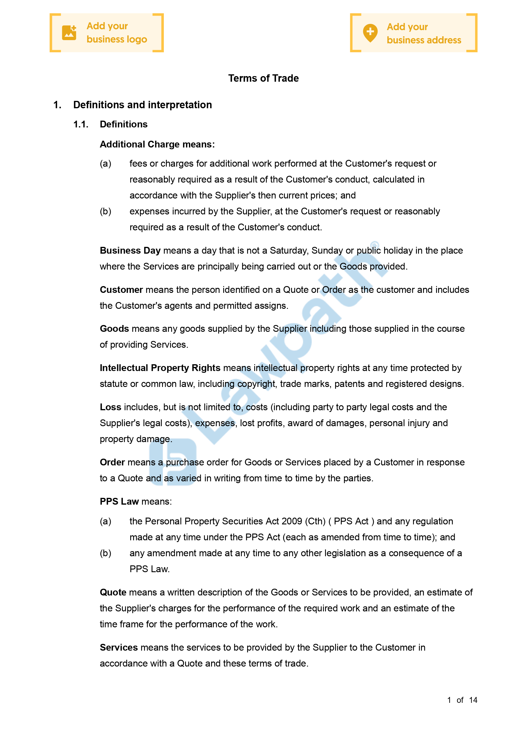 The terms in this document are designed to help protect your interests as a supplier or customer engaging in trade. When businesses enter into trade relationships without appropriate legal protection, they leave themselves open to liability down the track.