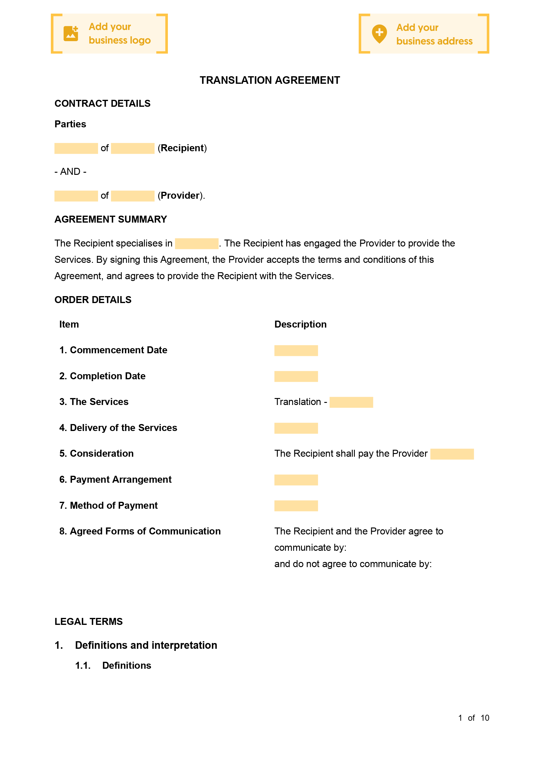As a translator, it's important that you have the right documents & agreements in place to make sure your services are delivered effectively, and even more importantly, that you get remunerated for those services. A Translation Agreement sets out the terms and conditions between you as the service provider and the recipient of your work (ie. client). If your business is providing translation services, or you are looking to provide services to another entity, you need to set out the terms and conditions of those services. A Translation Agreement sets out in writing the terms of service. This includes the services to be provided, how and when the services will be provided, and payment details regarding the services. It can also help prevent disputes arising throughout the term of the agreement.