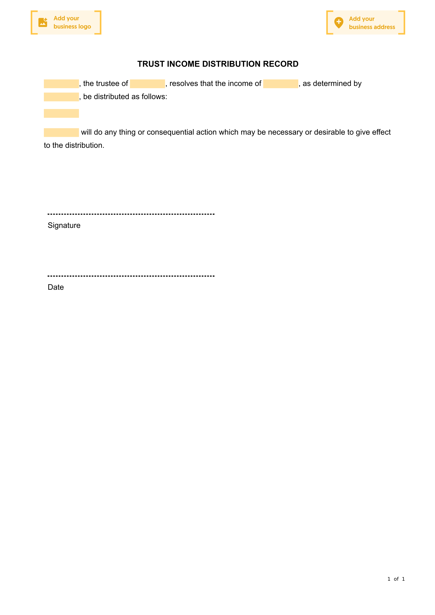 This Trust Income Distribution Record is used to record a decision to distribute trust income at the end of a financial year, where the trust only has one trustee.
