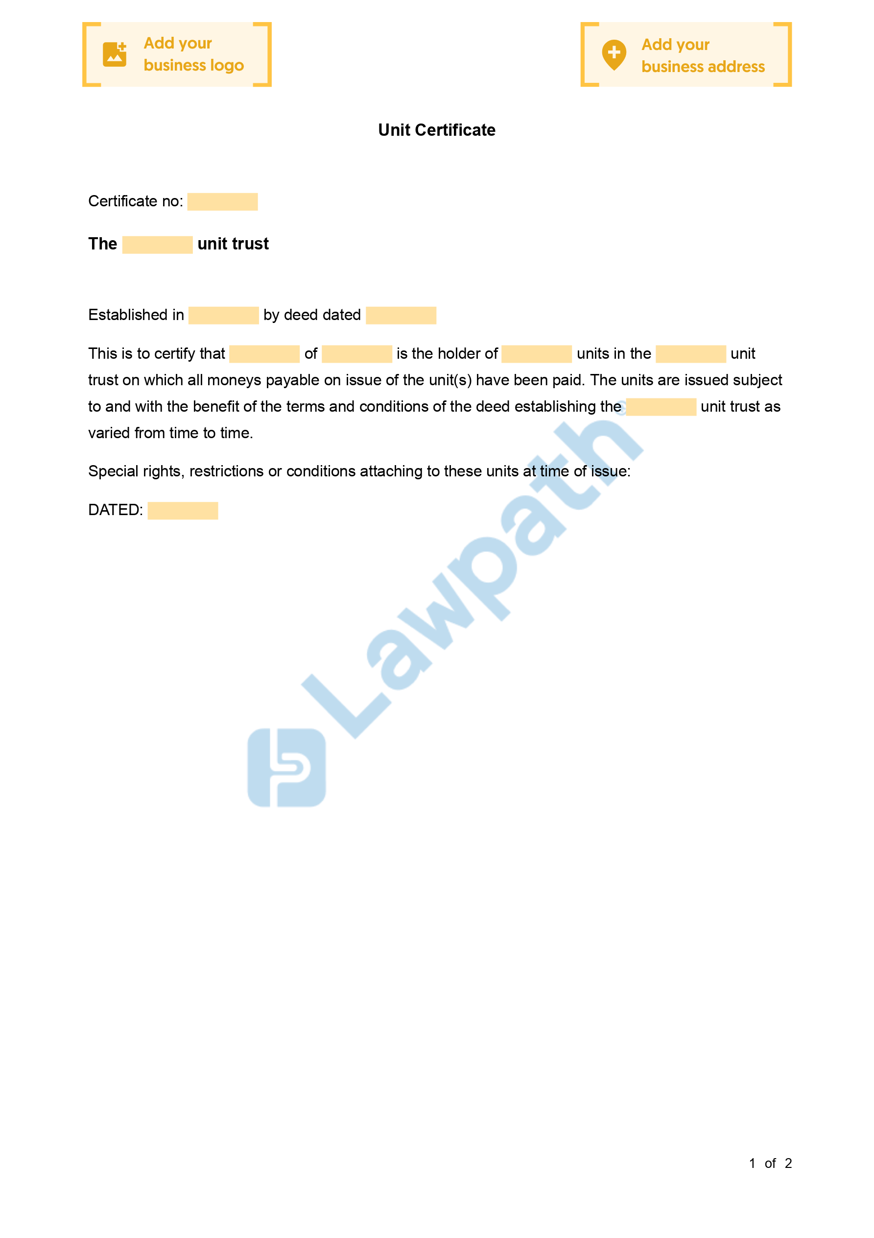 A Unit Certificate is used to outline each unit holder that the trustee has approved in addition to the class and number of units issued.