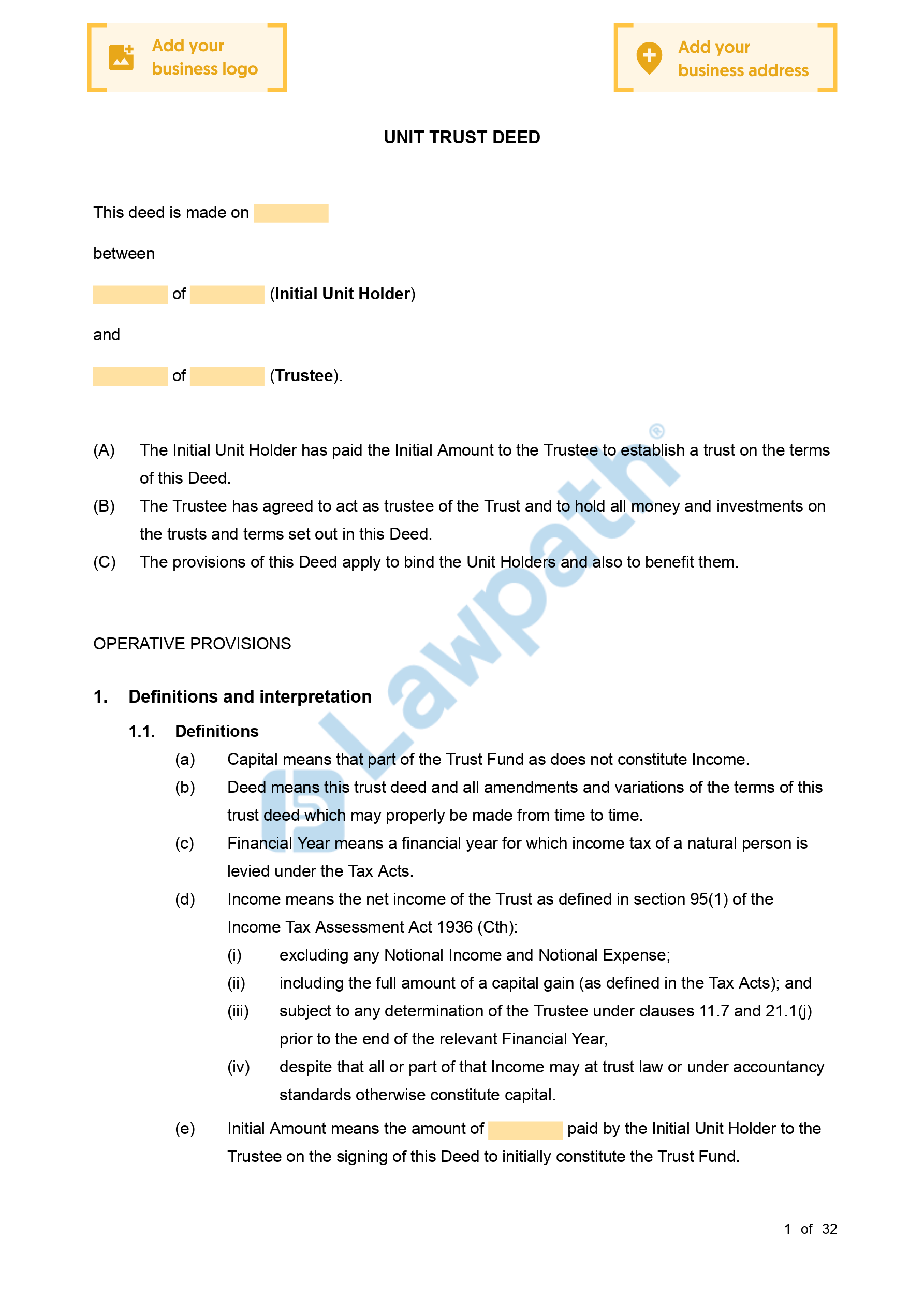 Create a quality Unit Trust Deed document using Lawpath’s instant document builder. Appoint a trustee and manager easily-draft yours now!