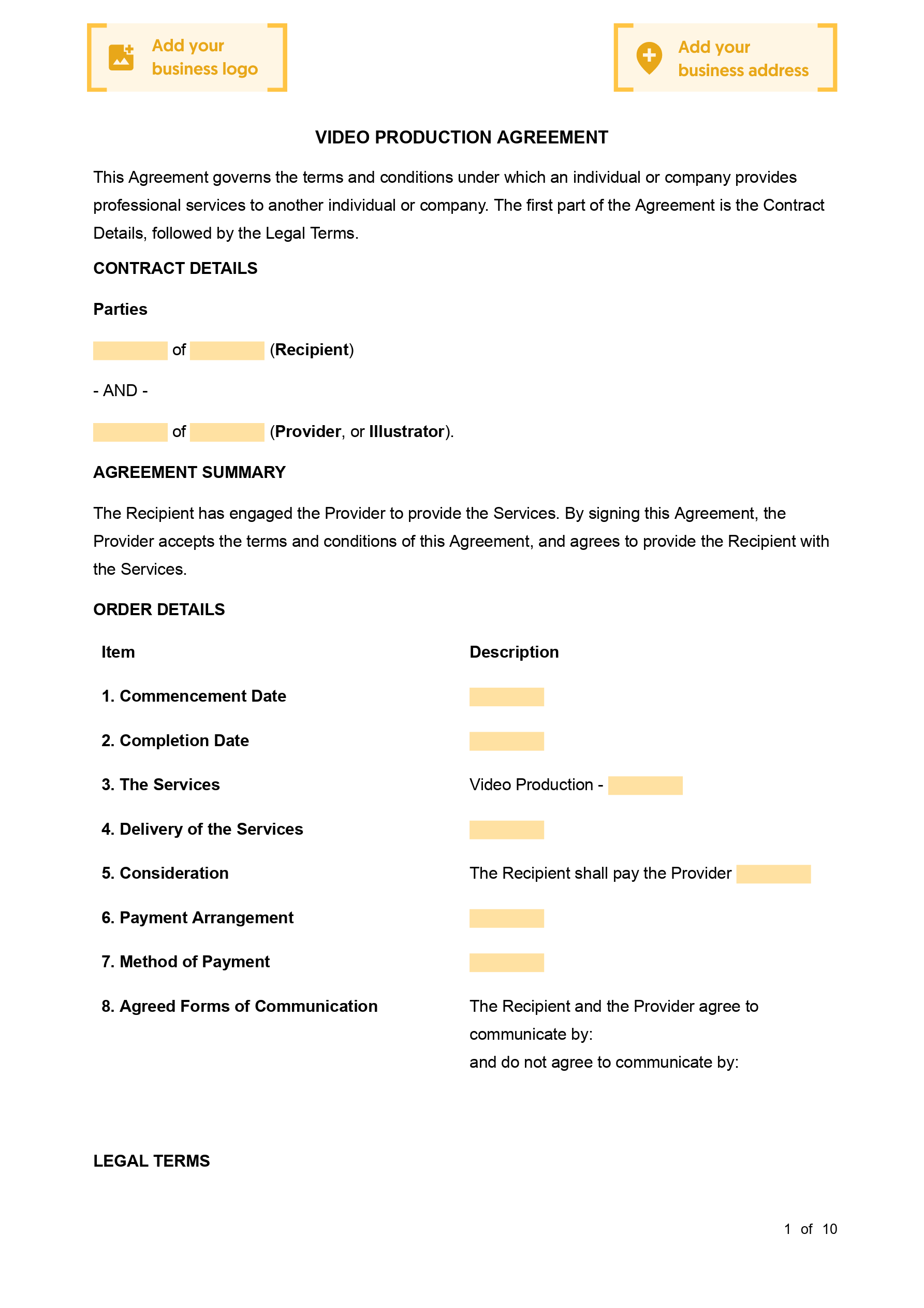 As a video producer, it's important that you have the right documents & agreements in place to make sure your services are delivered effectively, and even more importantly, that you get remunerated for those services. A Video Production Agreement sets out the terms and conditions between you as the service provider and the recipient of your work (ie. client). If your business is providing videoproduction services, or you are looking to provide services to another entity, you need to set out the terms and conditions of those services. A Video Production Agreement sets out in writing the terms of service. This includes the services to be provided, how and when the services will be provided, and payment details regarding the services. It can also help prevent disputes arising throughout the term of the agreement.