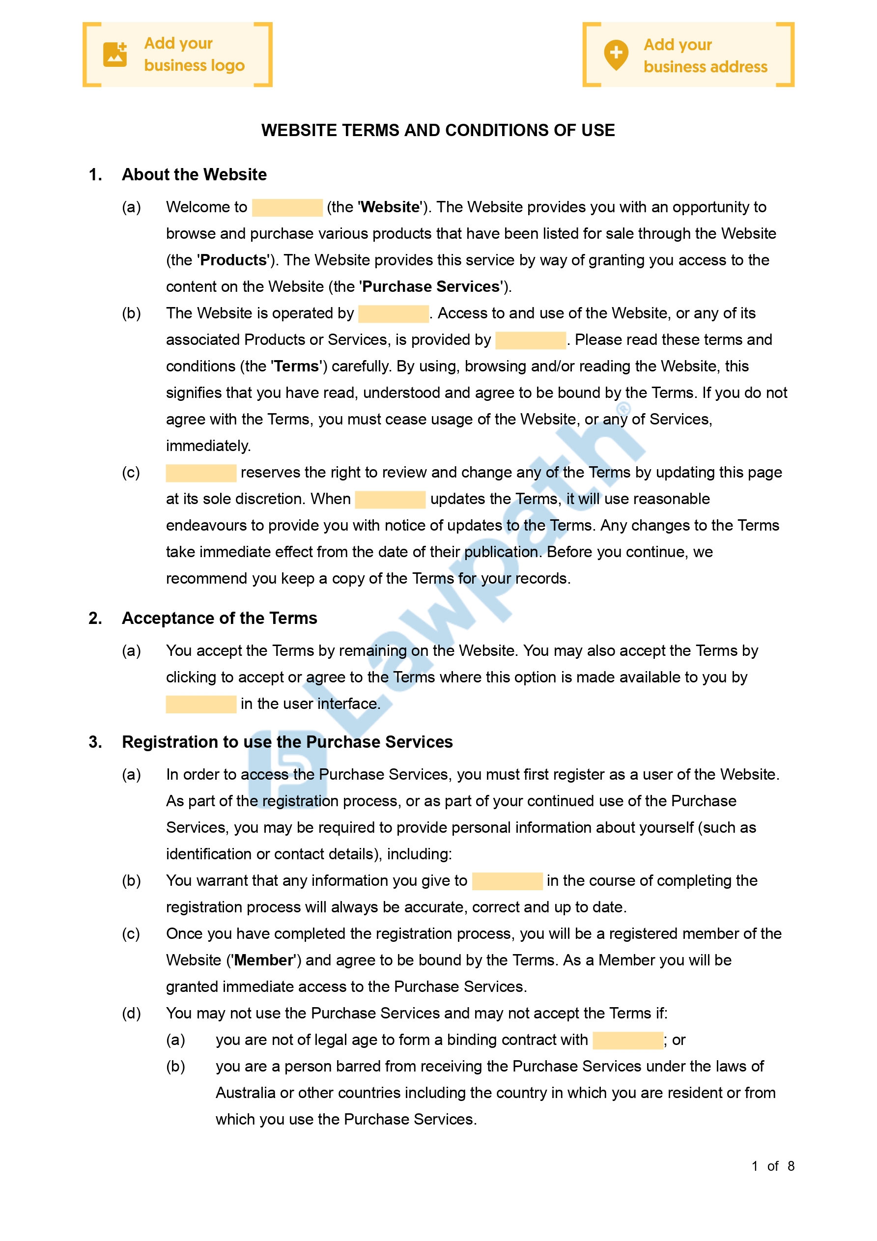 As a Websites Terms and Conditions of Use needs to be unique for your business it is recommended getting a lawyer to review this document to tailor it to your business’ specific needs.