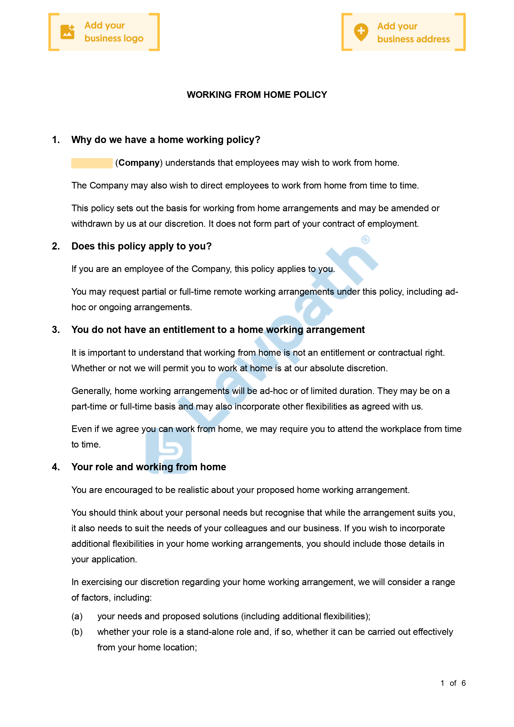 This Working from Home Policy creates a process for working from home requests and the key expectations for any employees working from home. This policy also helps protect your company and employees by establishing key work health and safety, data security and availability requirements for anyone working from home.