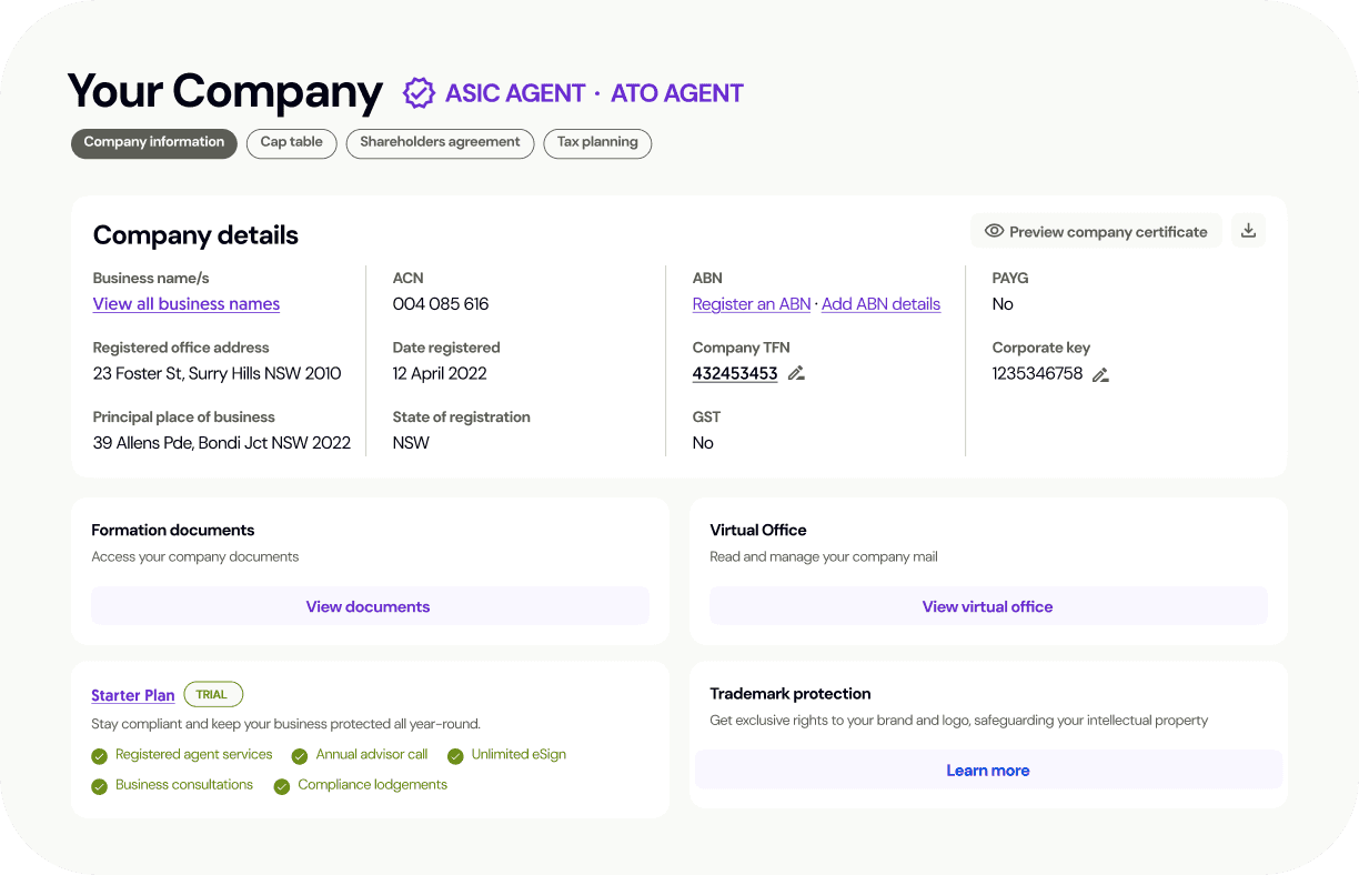 Keep everything in one place, from company documents to compliance and expert support, so nothing slips through the cracks.