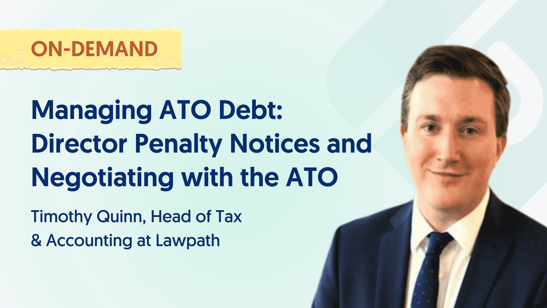 ATO debt can quickly become a serious problem—especially for company directors. In this webinar, Timothy Quinn from Lawpath will explain how Director Penalty Notices work, your responsibilities as a director, and how to effectively negotiate with the ATO to reduce financial and legal risk.