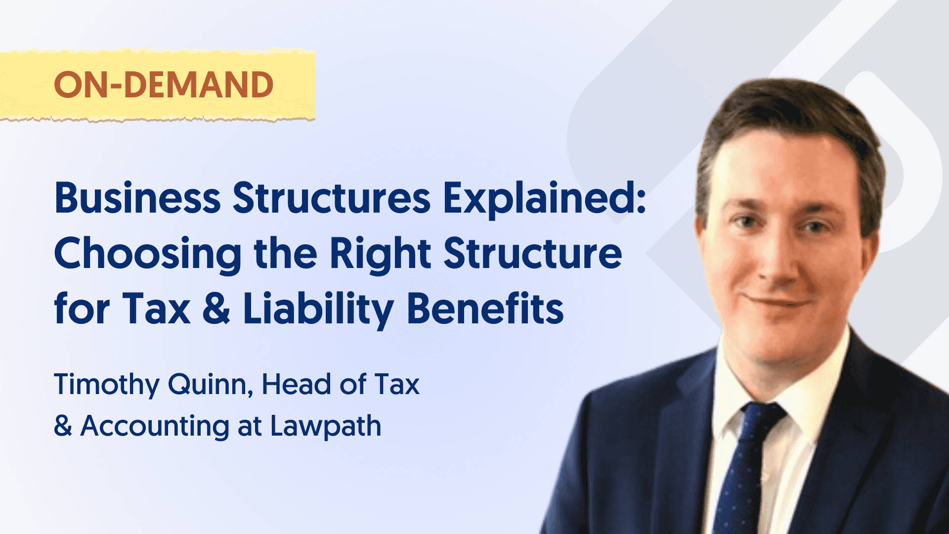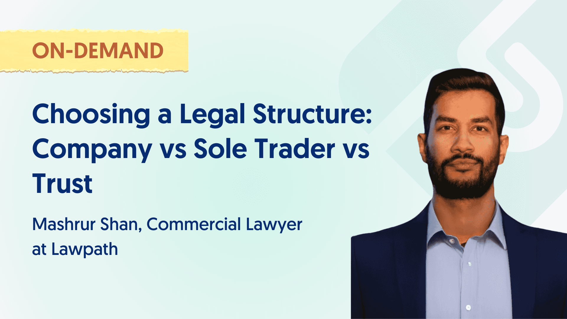 Not sure which legal structure is right for your business? In this webinar, Lawpath’s Mashrur Shan will break down the pros, cons, and tax implications of the three most common structures—sole trader, company, and trust—so you can make the right decision for your goals and risk profile.