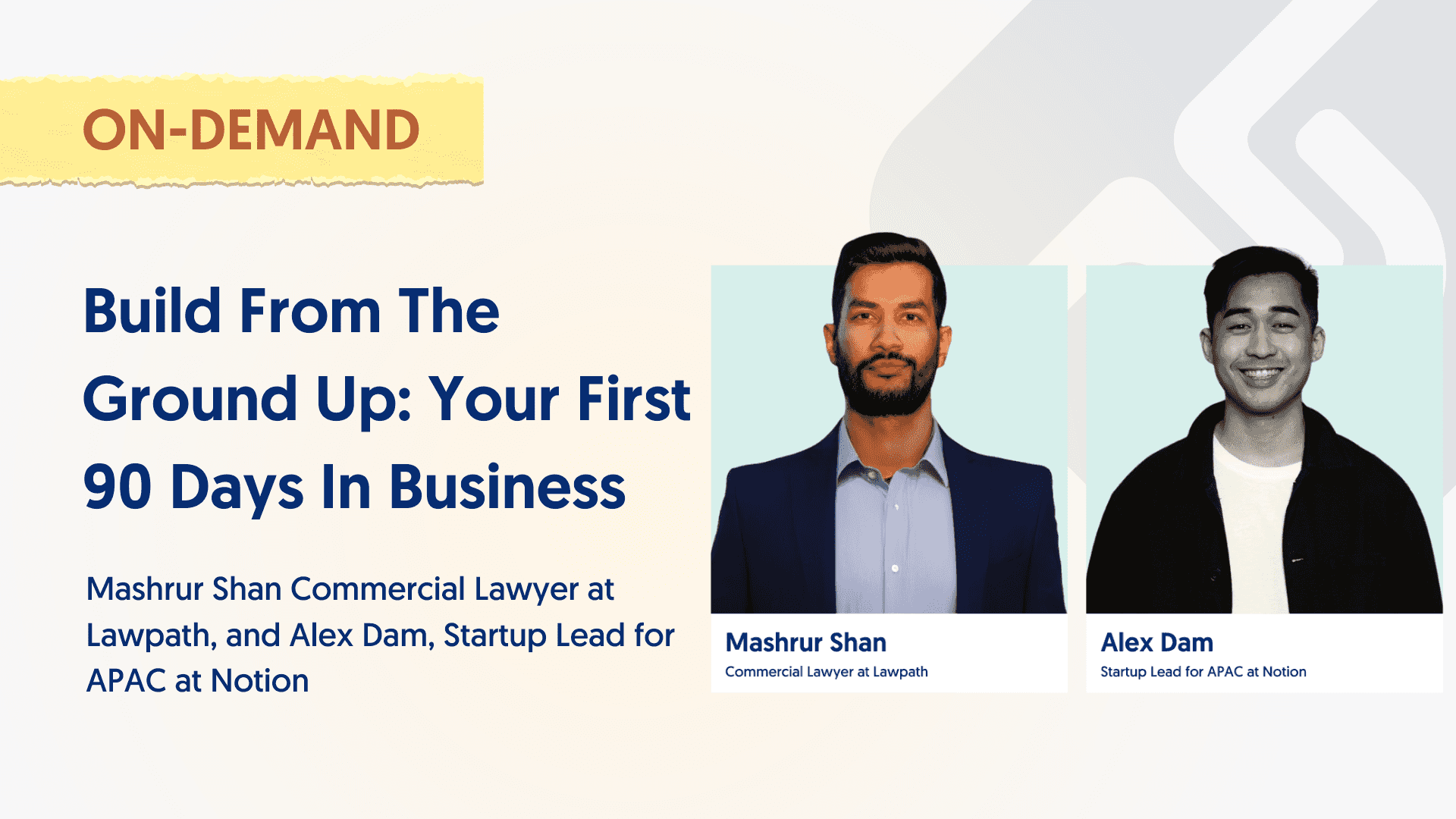 The first 90 days of starting a business are critical. From getting the legal essentials sorted to building systems that set you up for growth, the decisions you make early can have a lasting impact. In this free joint webinar, Mashrur Shan Commercial Lawyer at Lawpath, and Alex Dam, Startup Lead for APAC at Notion, will guide you through a practical 90-day roadmap to launch your business with both compliance and productivity in mind.