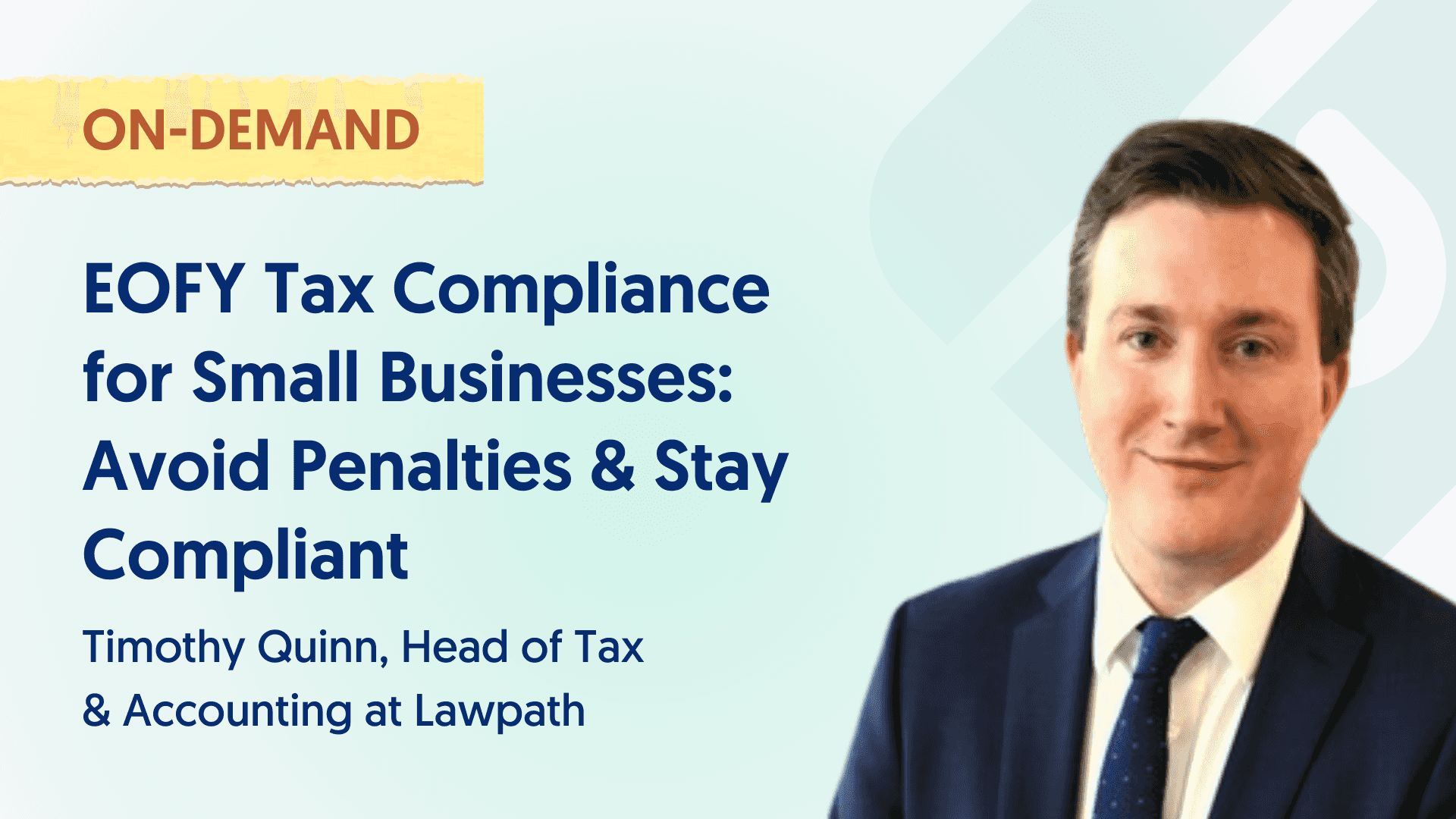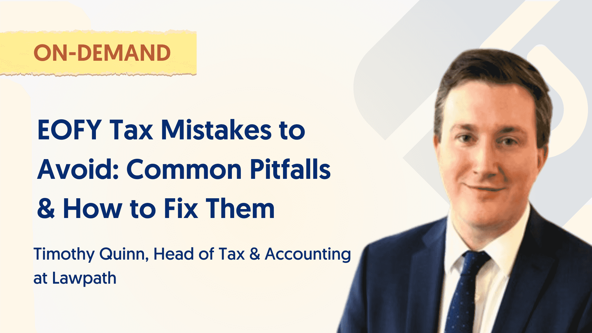 EOFY is a critical time for small businesses—but even small mistakes can lead to big penalties. In this webinar, Timothy Quinn, Head of Tax & Accounting at Lawpath, will uncover the most common EOFY tax pitfalls and share practical steps to avoid or fix them before it’s too late.